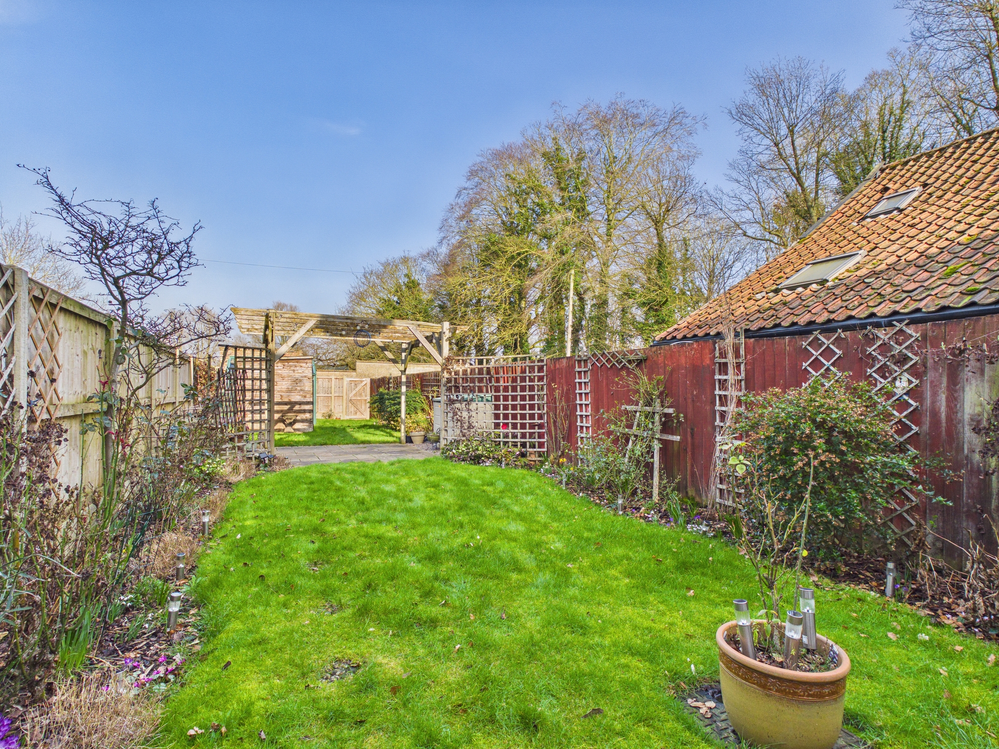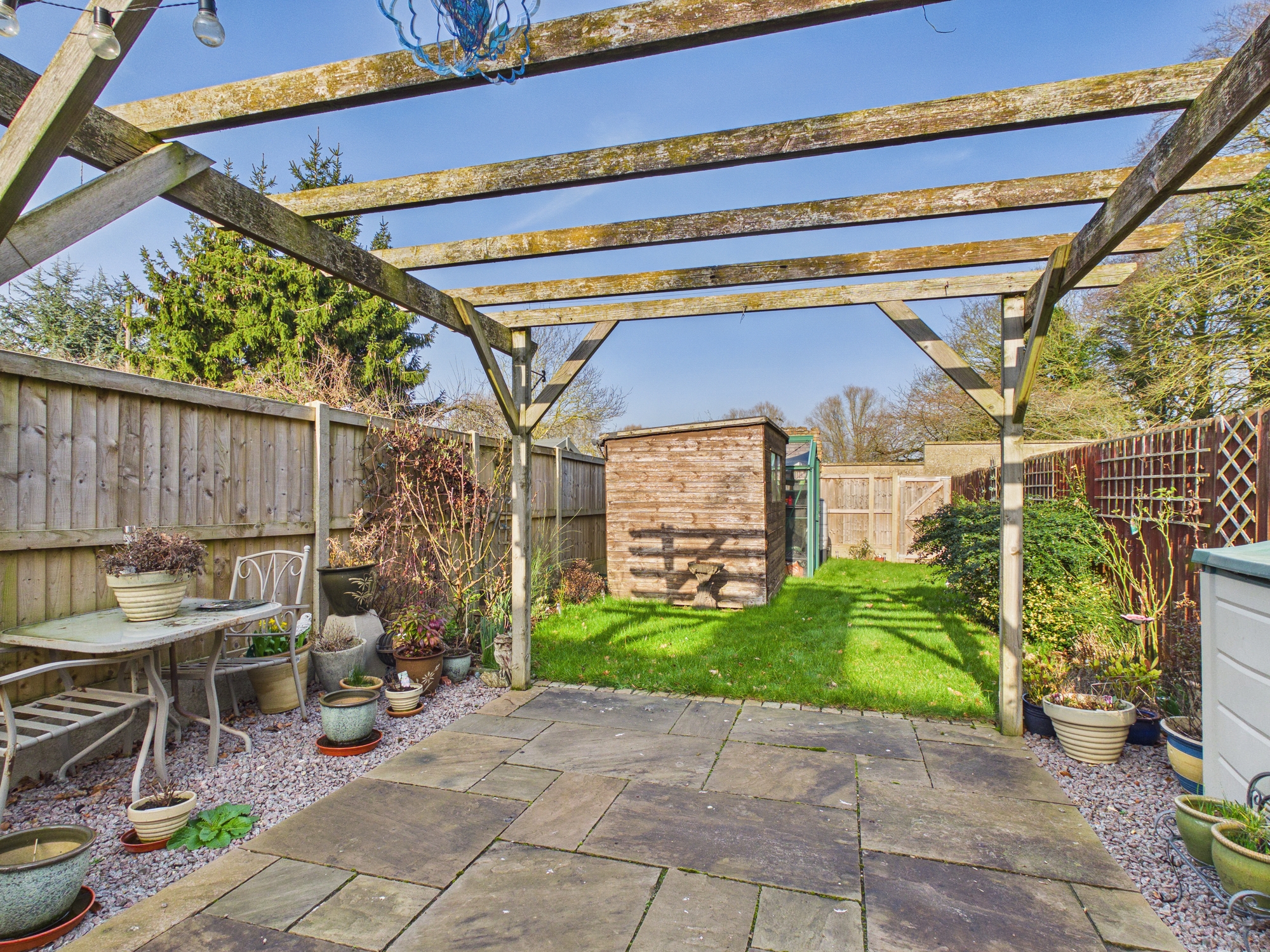 There is pedestrian access to the side, shared with neighbouring properties, giving access to the rear garden. Here it is mainly laid to lawn with patio and pergola. A range of bushes and shrubs are inset and to borders with a wooden storage shed and a greenhouse, all enclosed by fencing.