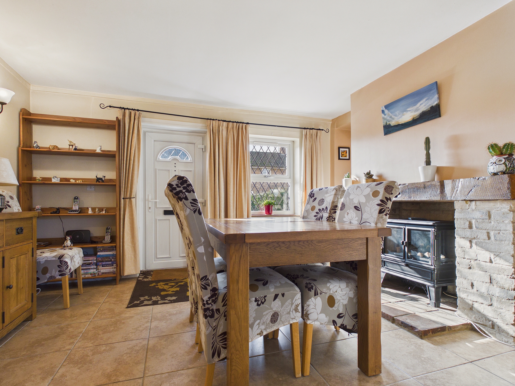 uPVC double glazed window to front, brick central fireplace with electric fire inset, wall mounted double panel radiator, tiled flooring, part glazed door to kitchen, door to:-