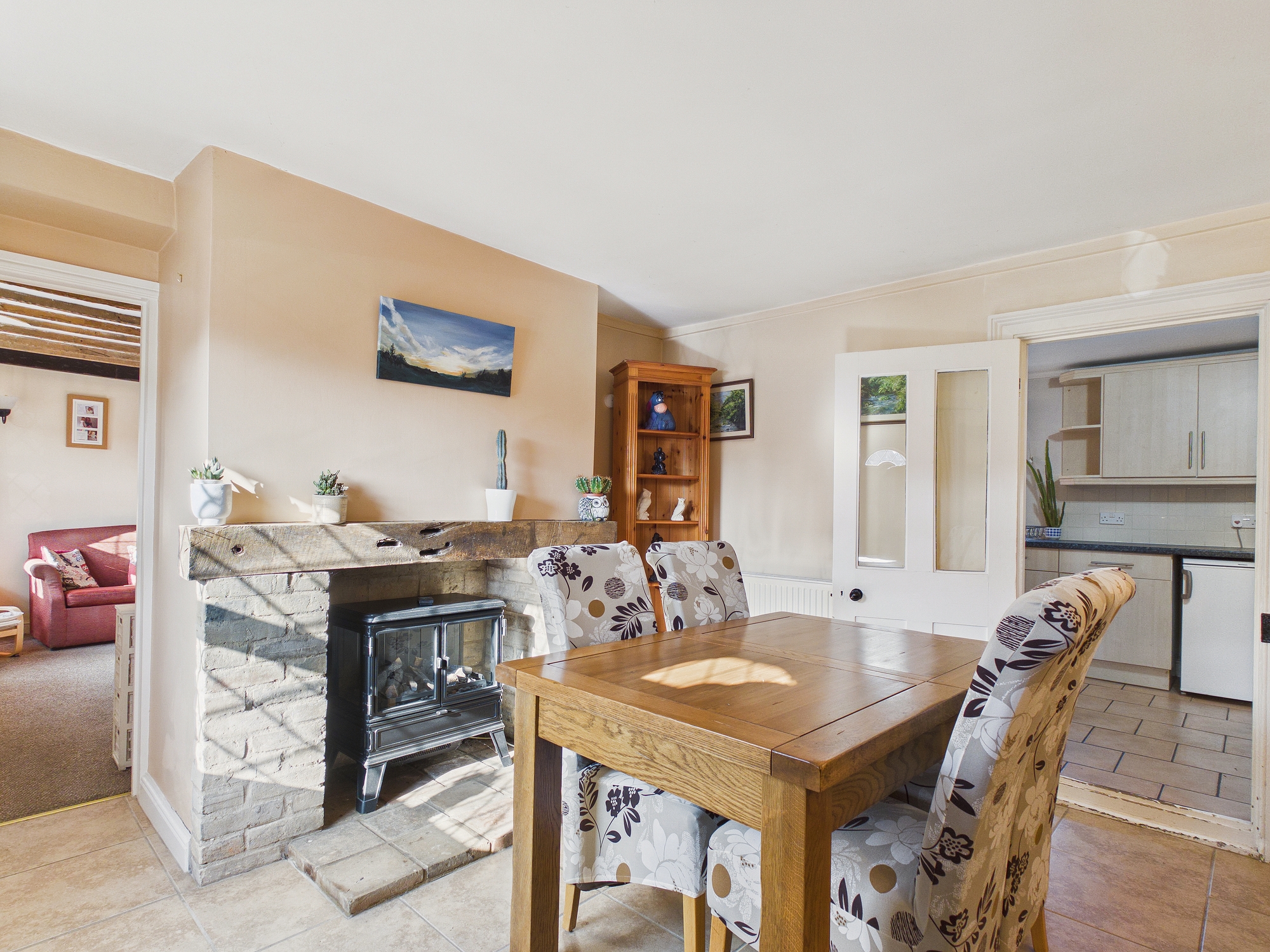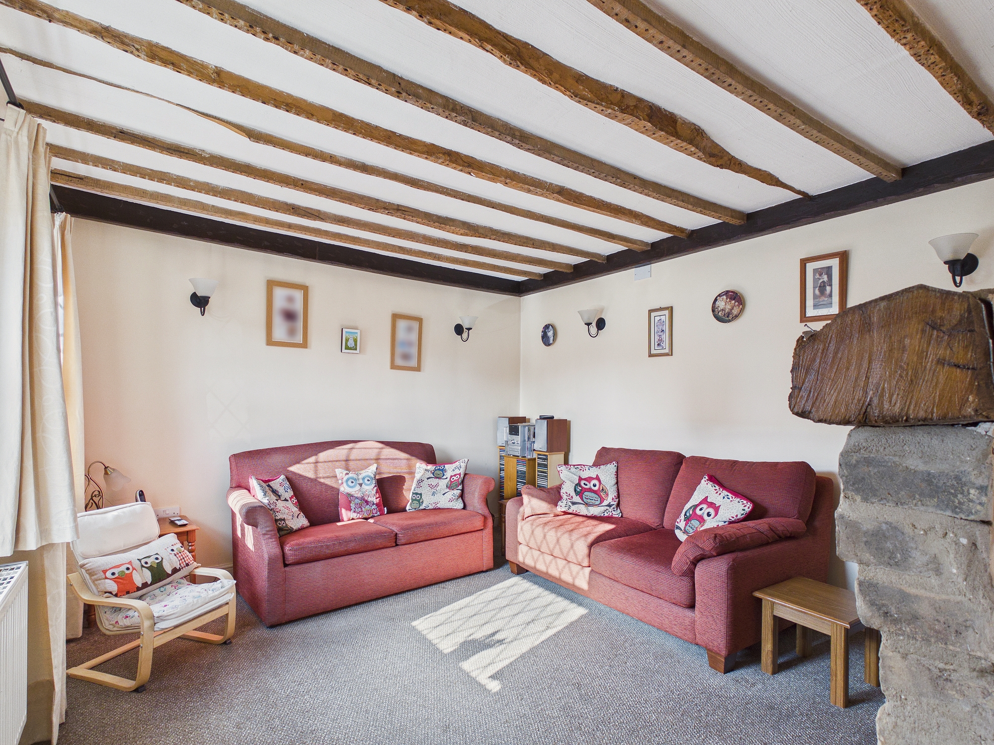 2 x uPVC double glazed window to front, brick central fireplace with electric fire inset, beams to ceiling.