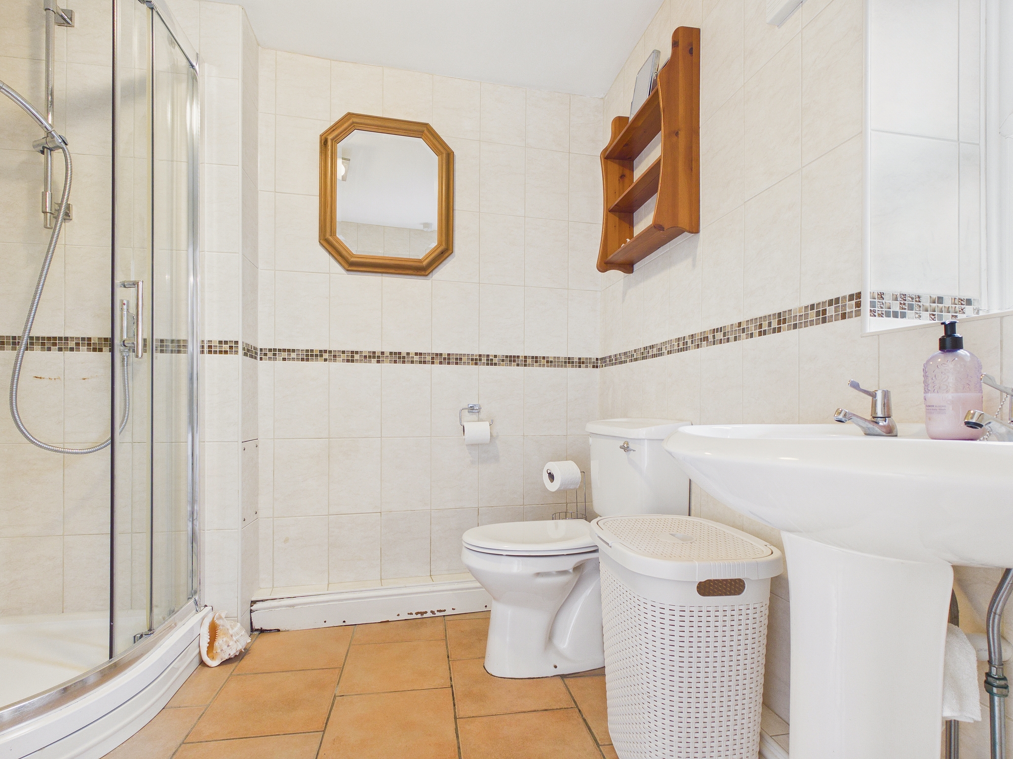 uPVC double glazed window to rear, wall mounted heated towel rail, corner shower cubicle, w.c., pedestal handwash basin, tiled flooring, extractor.