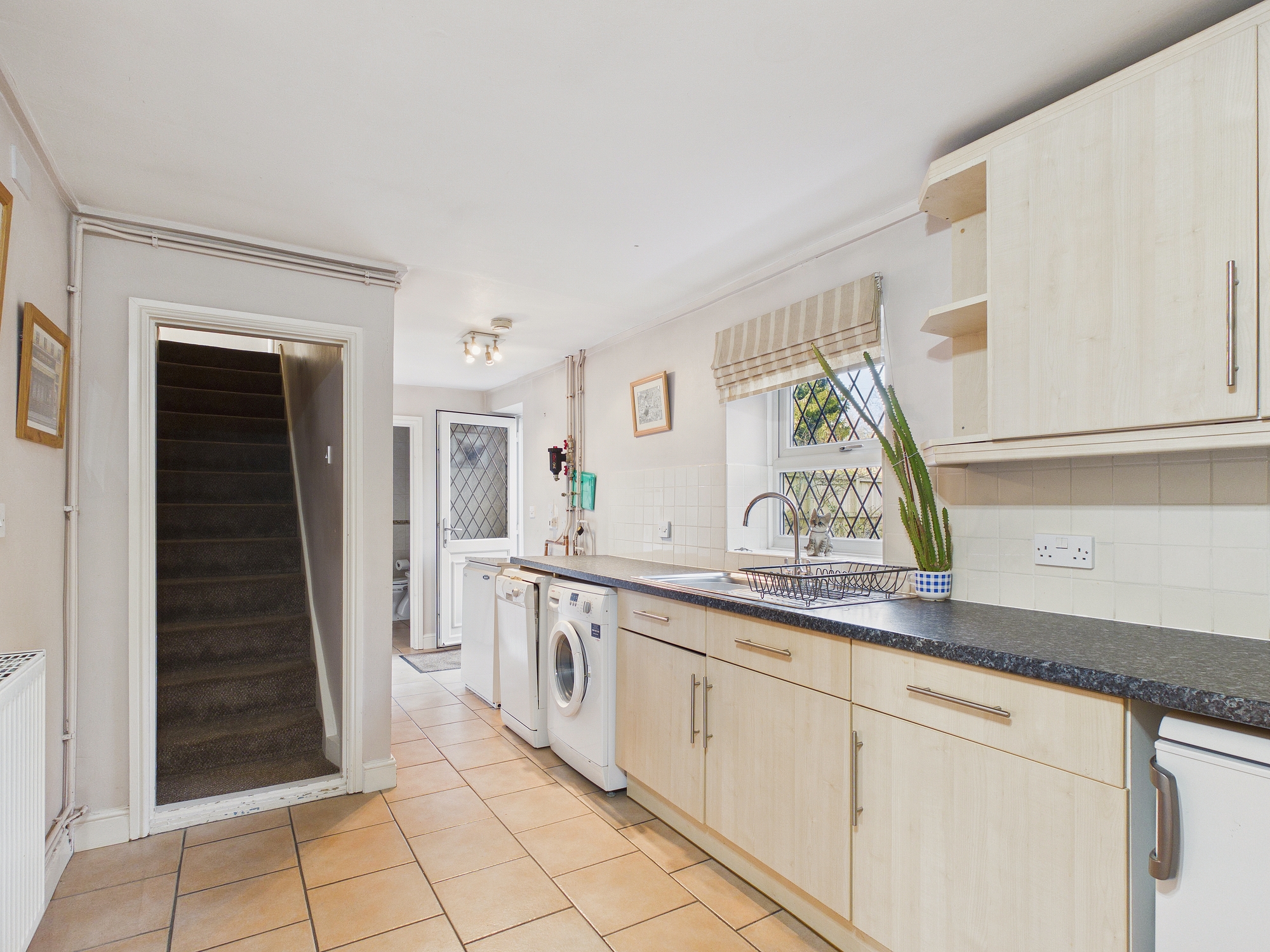uPVC double glazed window to rear, uPVC double glazed door to rear garden, wall mounted double panel radiator, wall and base units under round edge worksurfaces, stainless steel sink drainer insert with mixer tap over, 4 ring electric hob inset to worksurface with oven under and extractor over, space for undercounter fridge, space for washing machine, space for slim line dishwasher, free standing oil central heating boiler, stairs to first floor, tiled flooring, door to understairs storage cupboard, door to:-