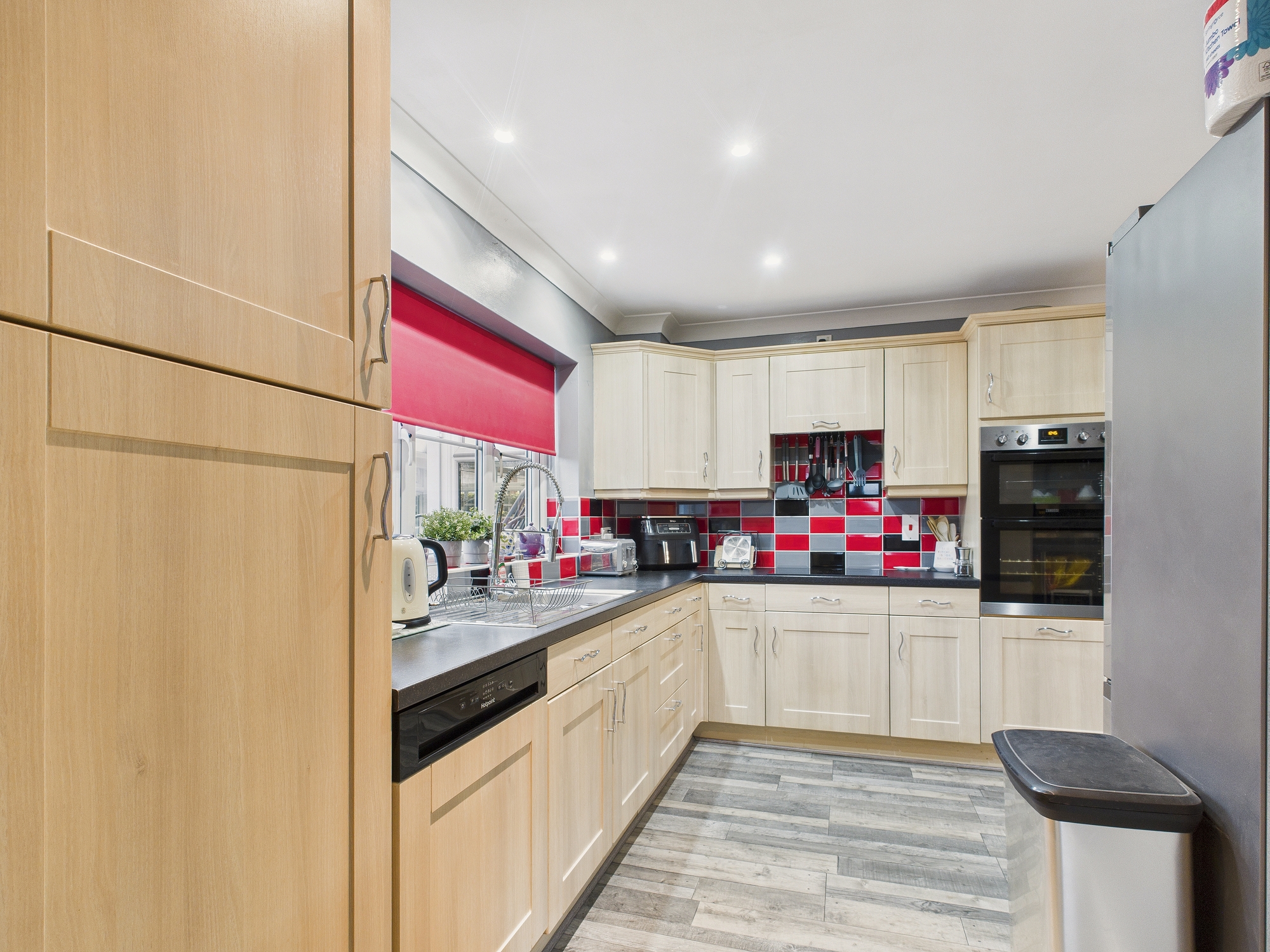 uPVC double glazed window to the rear, uPVC double glazed door to the side, base units under round edge worktop with stainless steel sink and drainer inset with mixer tap, wall mounted single panel radiator, storage cupboard, space for washing machine, space for further under counter appliance, coved ceiling, tiled flooring, wall mounted single panel radiator, integral door to garage.