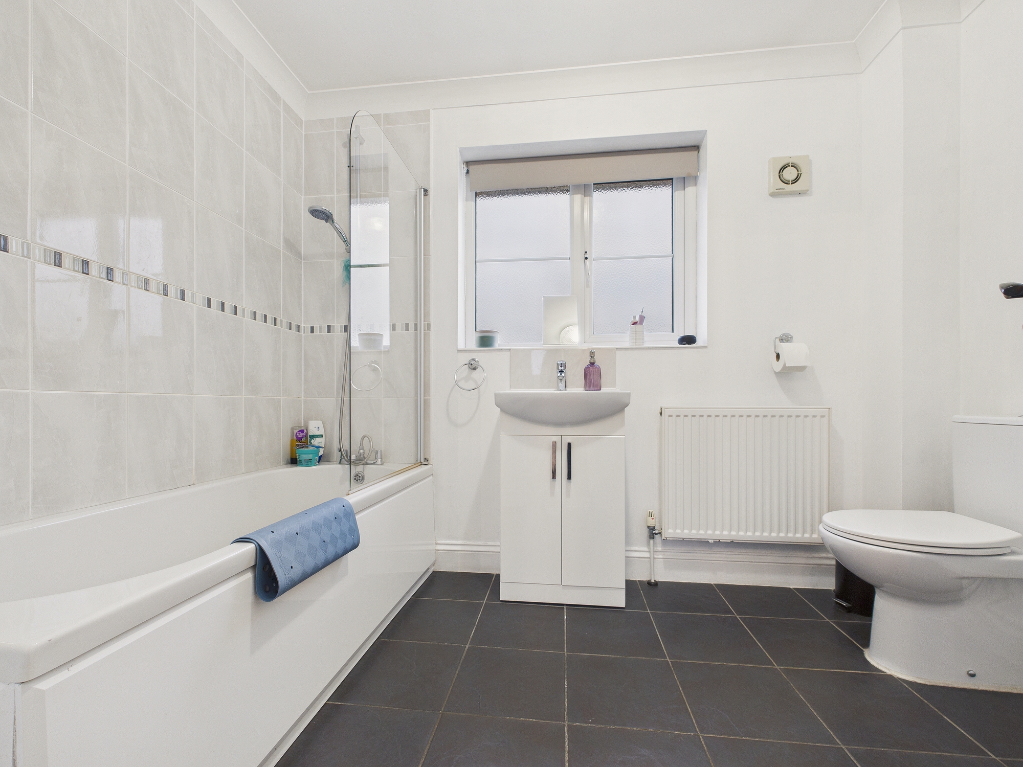 uPVC double glazed window to the rear , wall mounted single panel radiator, panelled bath with shower and glass screen over, hand basin inset to vanity unit, WC, tiled flooring, coved ceiling, extractor.