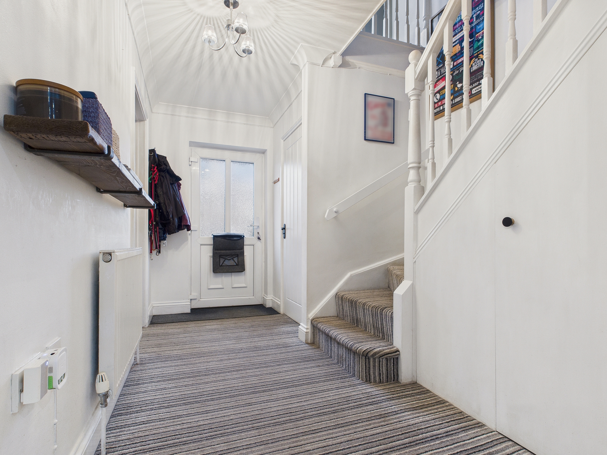 Wall mounted single panel radiator, stairs to first floor with storage cupboard under, coved ceiling, door to cloakroom, door to kitchen, door to:-