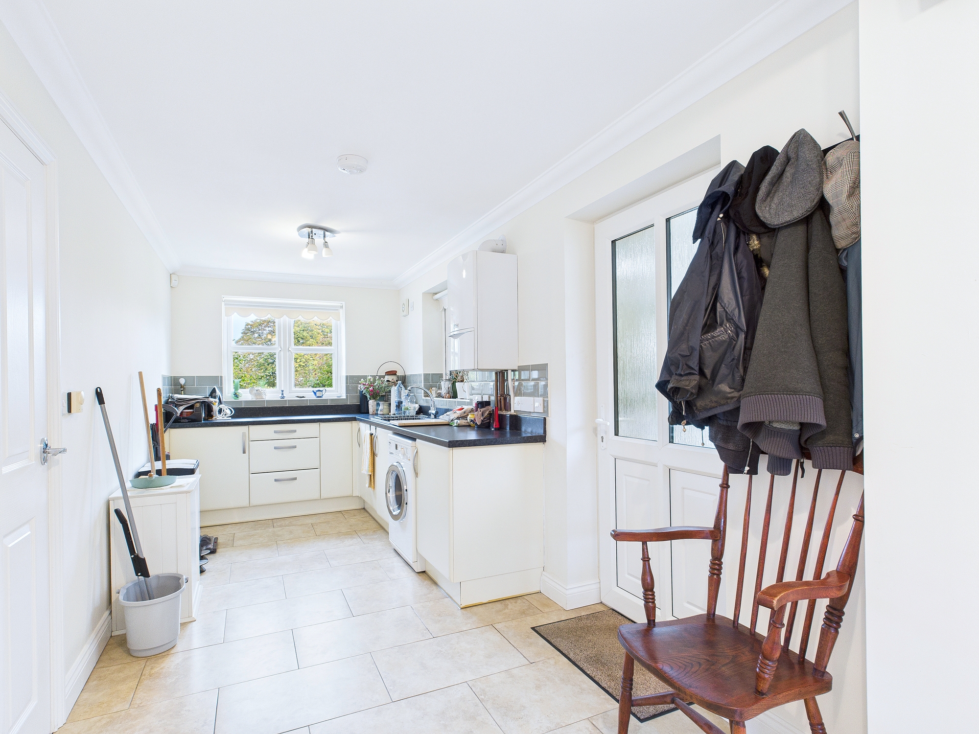 uPVC double glazed windows to both front and side aspect, further range of matching wall and base storage units and work surfaces and tiled splashbacks, wall mounted gas central heating boiler, space for appliances, double doors to airing cupboard housing pressurised hot water cylinder, ceramic floor tiling, door to cloakroom and uPVC double glazed opening to:-