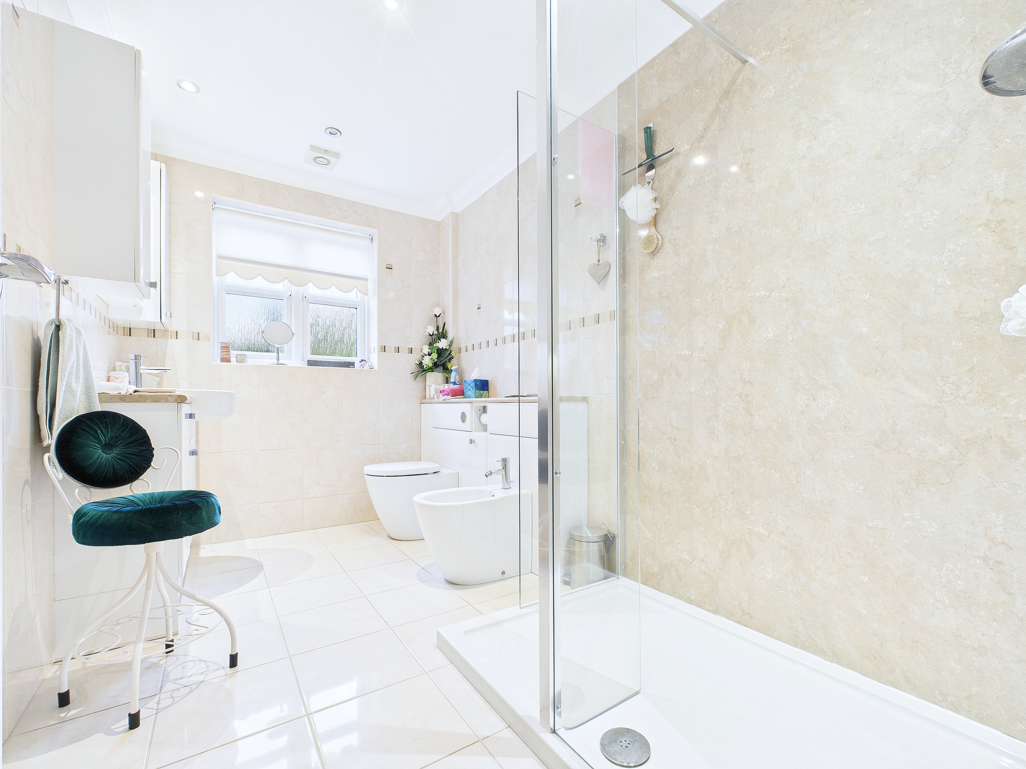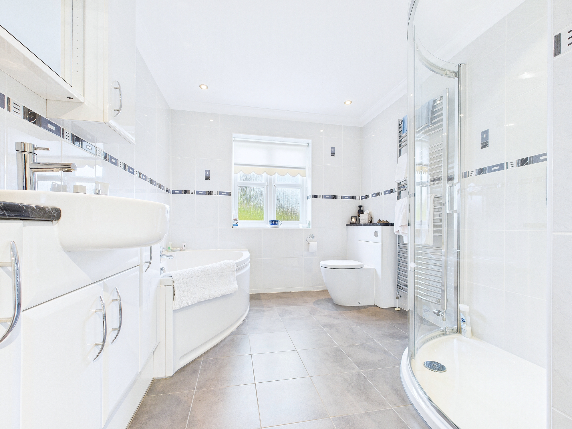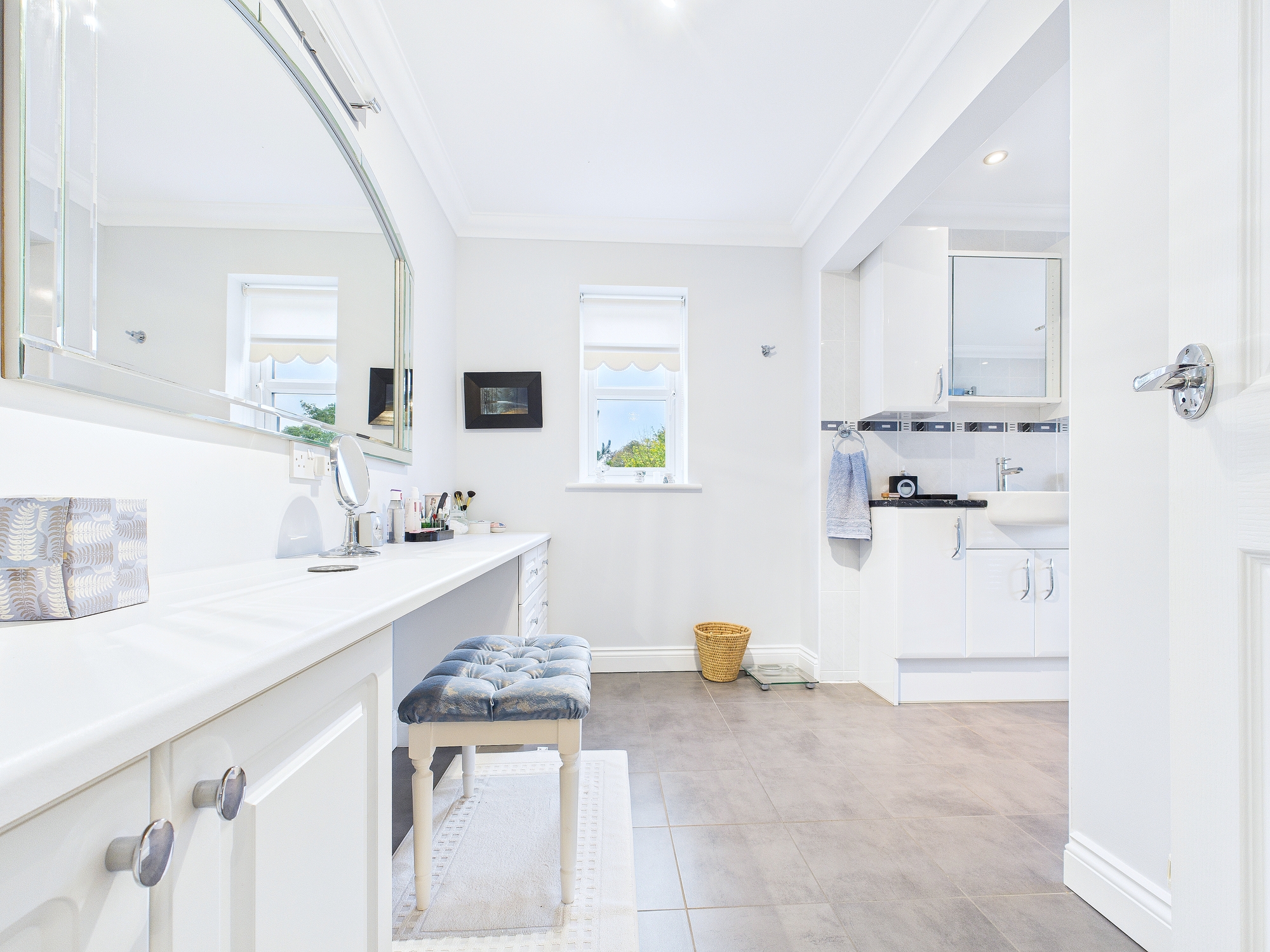 uPVC double glazed window to front, corner bath, double width corner shower cubicle, concealed cistern w.c., circular handwash basin inset to storage unit with further storage units over, wall mounted chrome style towel radiator, further uPVC double glazed window to the side, built in dressing table with storage cabinets and drawers to either side, ceramic floor tiling extending throughout, additional double panel radiator, coved ceiling and spotlights.