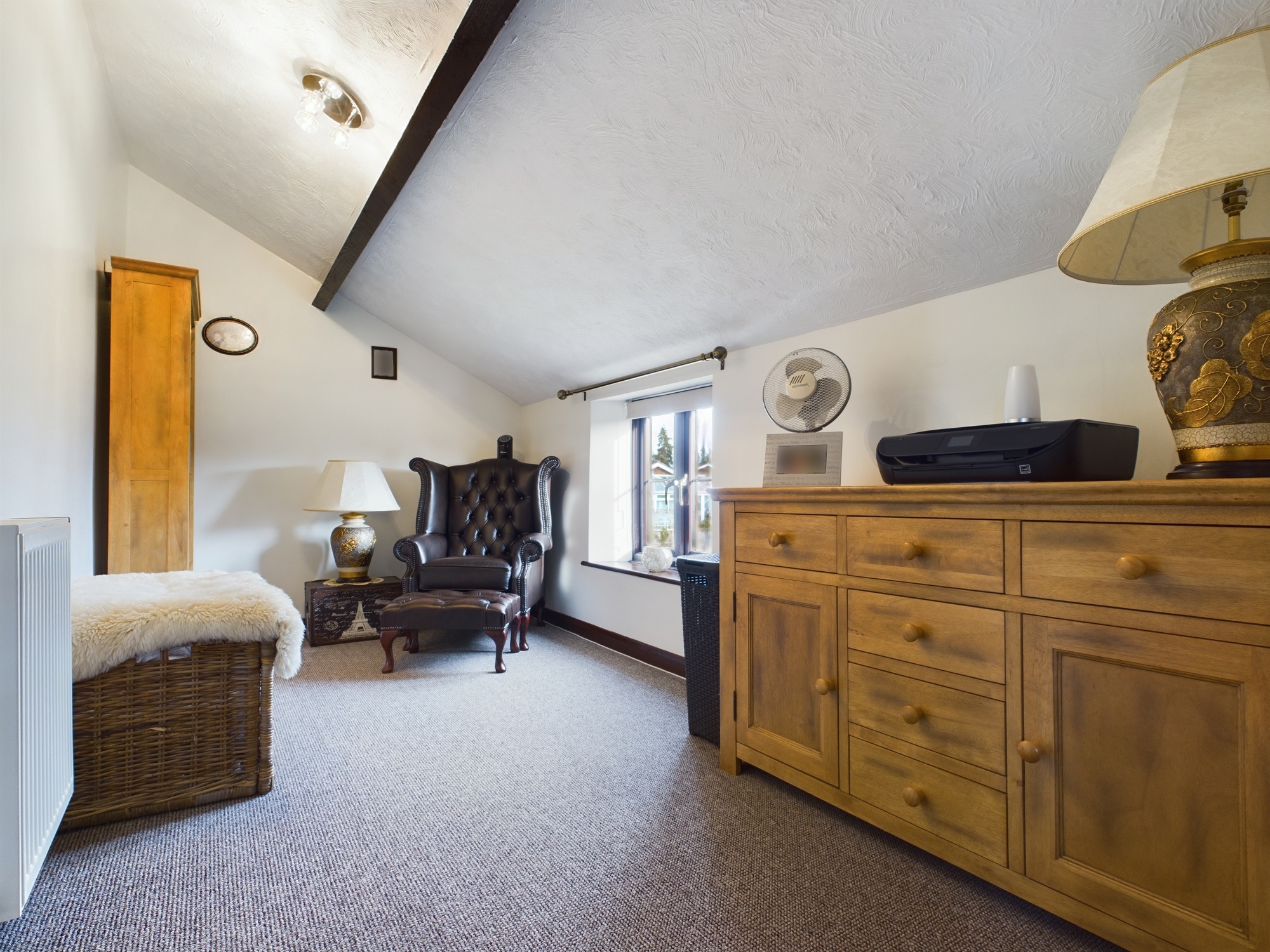 uPVC double glazed window to rear, wall mounted double panel radiator, textured ceiling with beam inset, door to second bedroom.