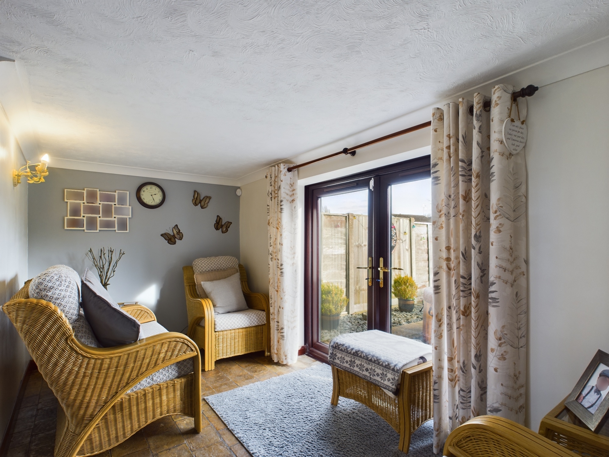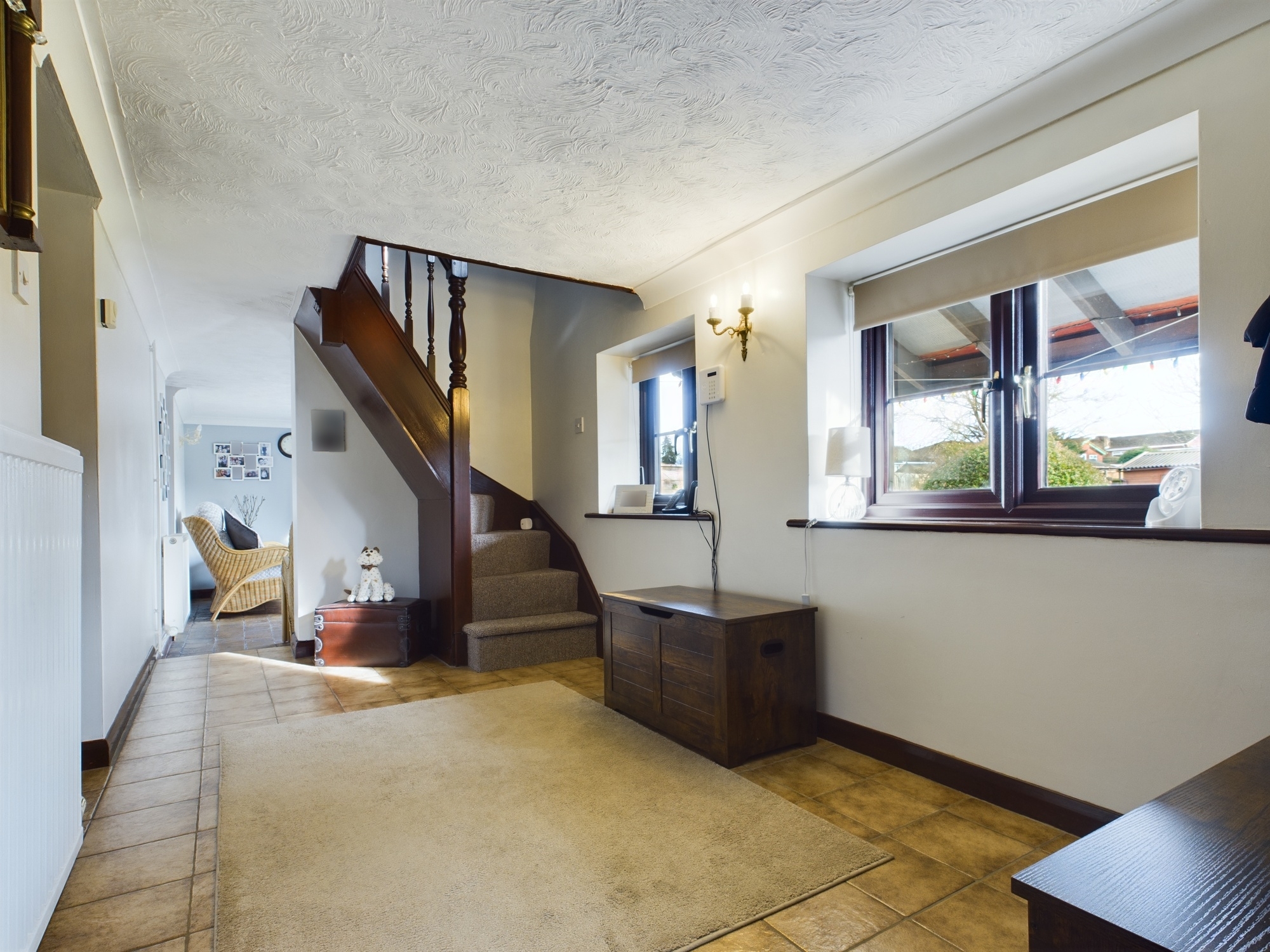 uPVC double glazed patio doors to rear, wall mounted double panel radiator, original quarry tiled flooring, textured and coved ceiling, door to:-