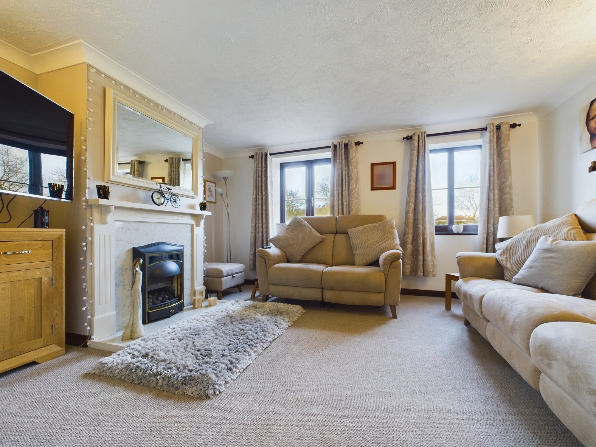 2 x uPVC double glazed window to front, wall mounted double panel radiator, central fireplace with gas fire inset, textured and coved ceiling.