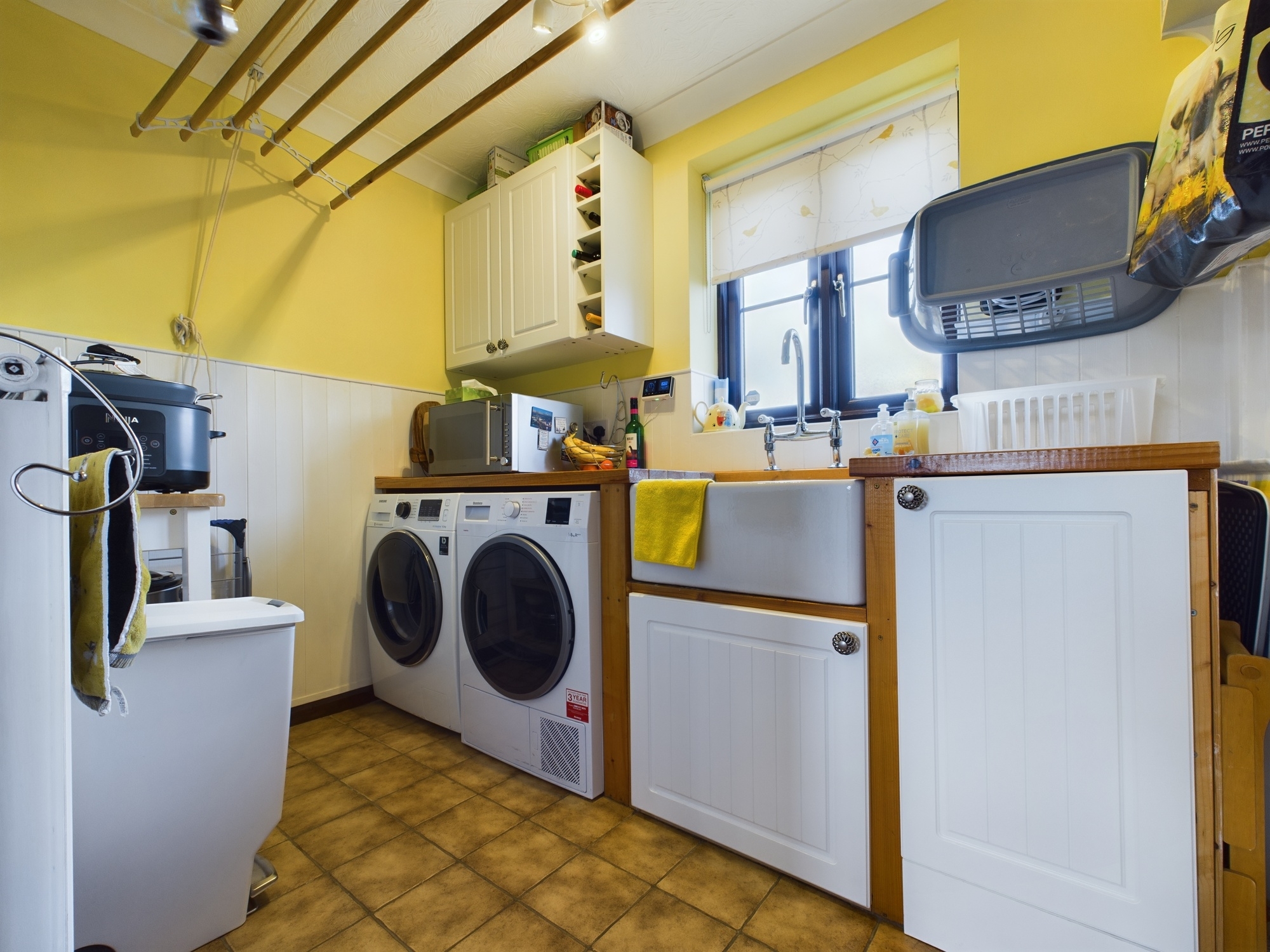 Wooden worksurface with storage cupboards under and wall mounted units over, butler style sink inset, space for washing machine and tumble drier, wall mounted double panel radiator, part panelling to walls, tiled flooring, textured and coved ceiling, door to:-