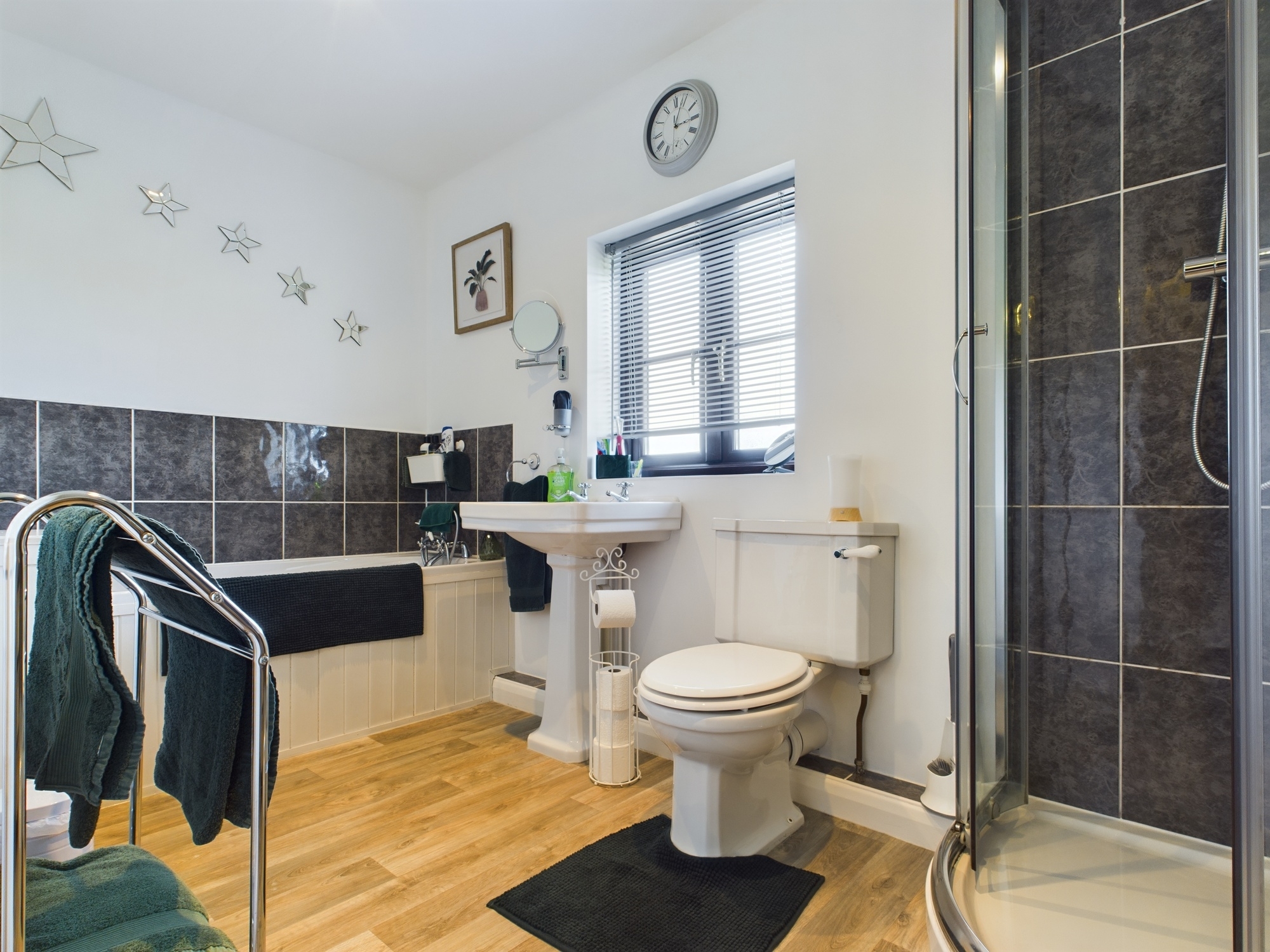 uPVC double glazed window to front, wall mounted double panel radiator, panelled bath with mixer tap and shower attachment with tiled surround, corner shower cubicle with sliding glass door, pedestal handwash basin, w.c., lino style flooring, loft access, extractor.