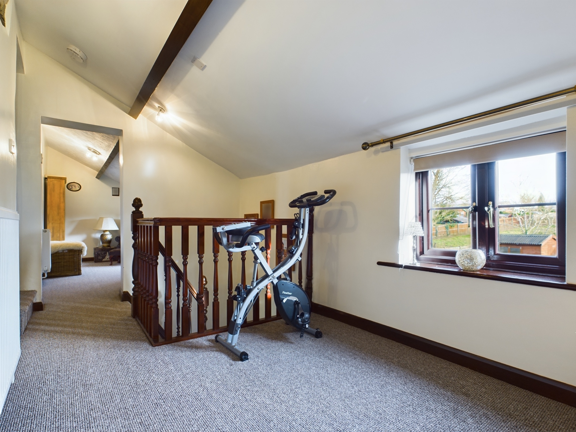 uPVC double glazed window to front, wall mounted double panel radiator, beam to ceiling, opening through to study, doors to all rooms, steps up to further landing with eaves storage cupboard.