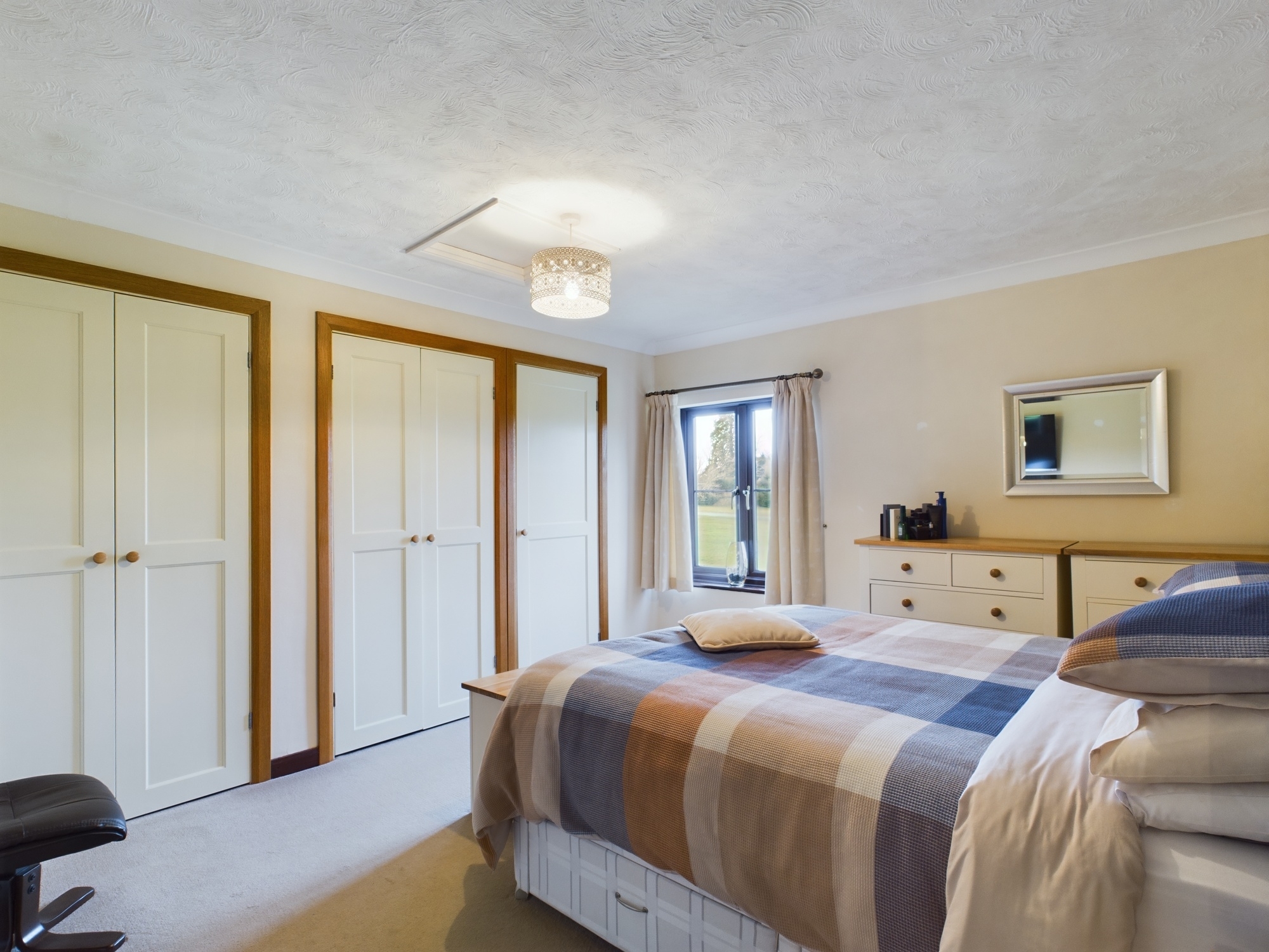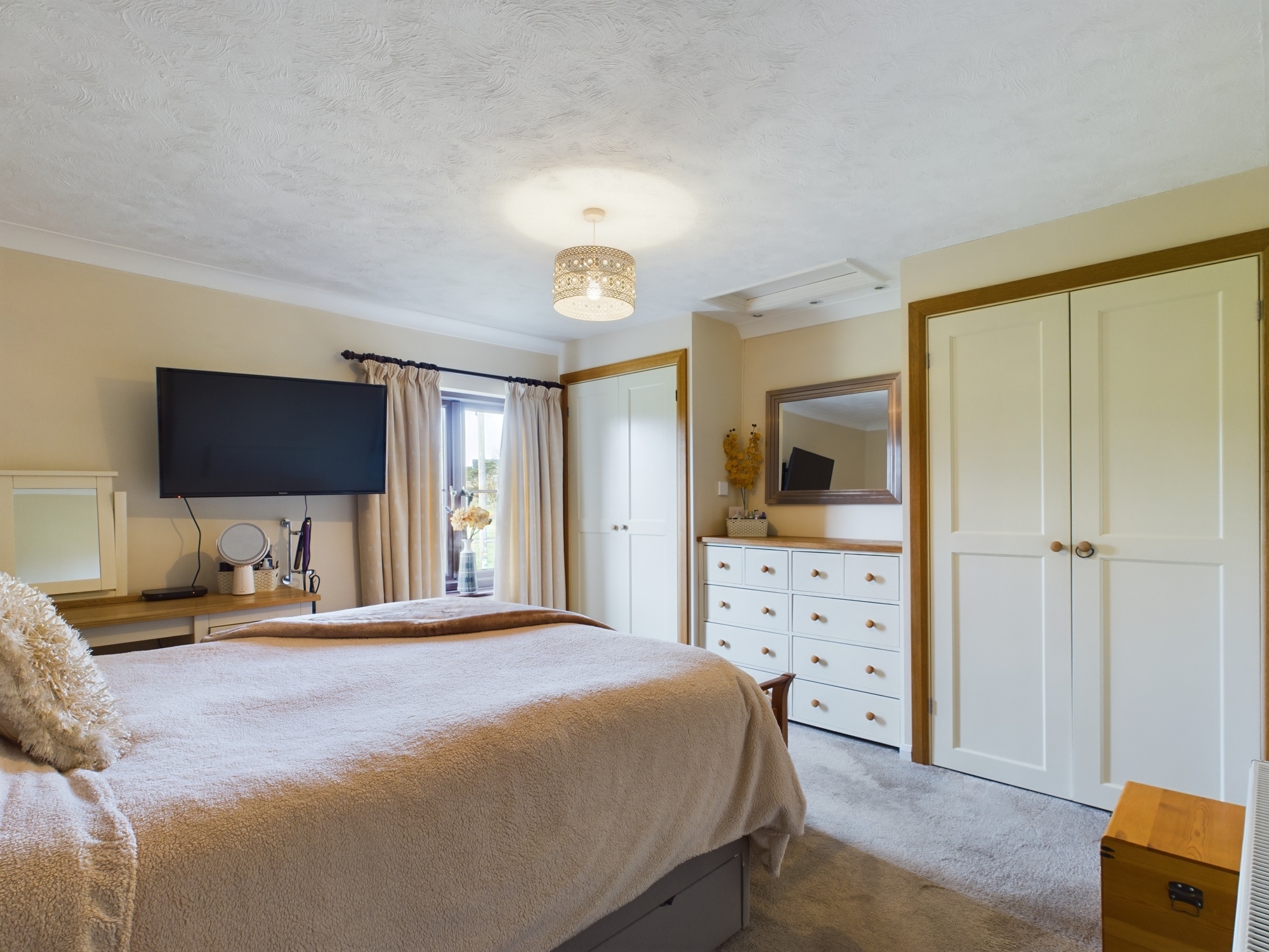 uPVC double glazed window to front, wall mounted double panel radiator, built in wardrobes with storage drawers, loft access, textures and coved ceiling.