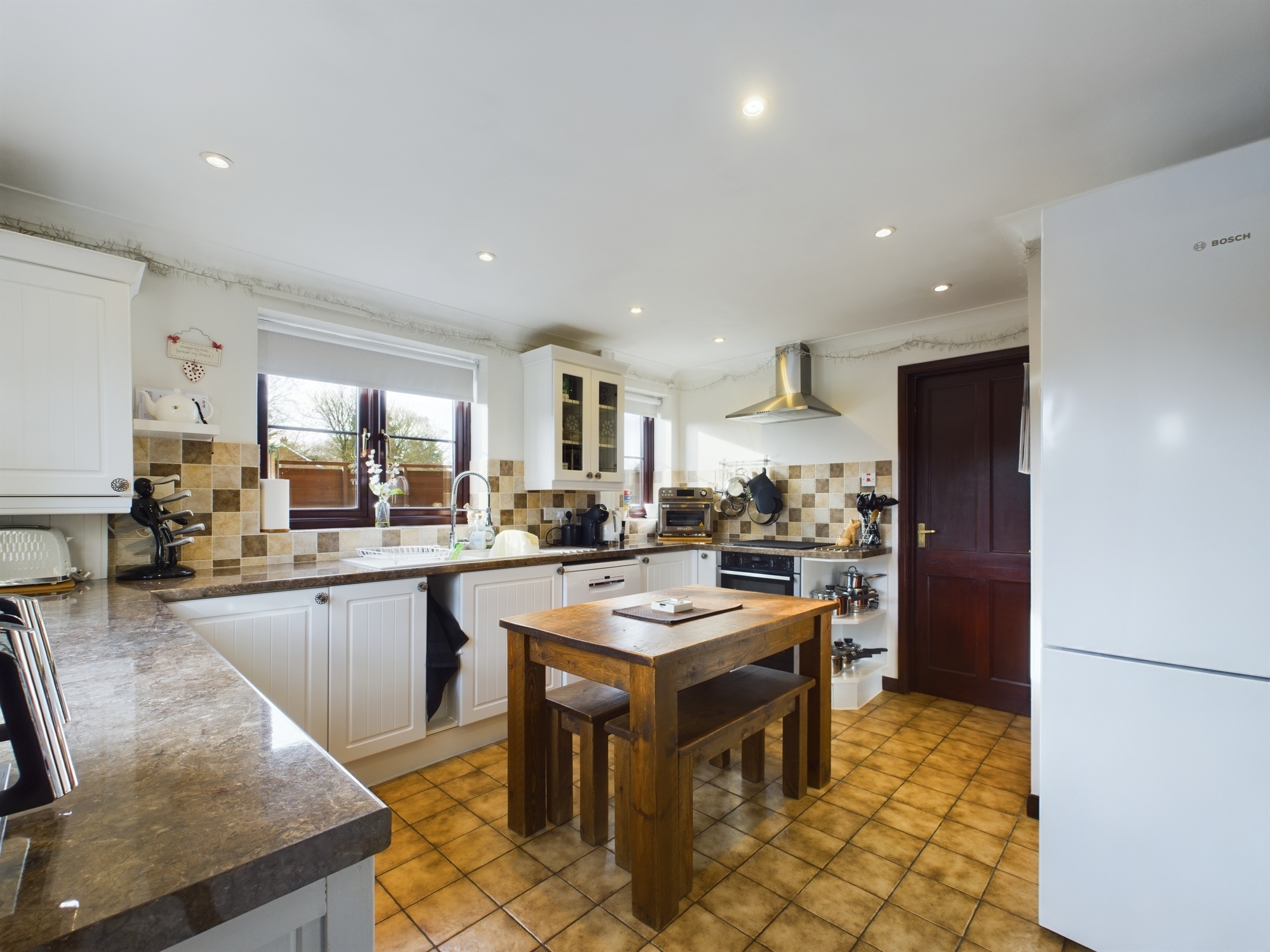 uPVC double glazed window to side and rear, wall mounted double panel radiator, door to pantry cupboard, wall and base units under round edge worksurfaces, 1 1/2 sink drainer inset with mixer tap over, wall mounted gas central heating boiler, 4 ring “Neff” induction hob with double oven under and stainless steel extractor over, space for dishwasher, space for fridge/freezer, door to utility room, coved ceiling with spotlights inset, tiled flooring, door to:-