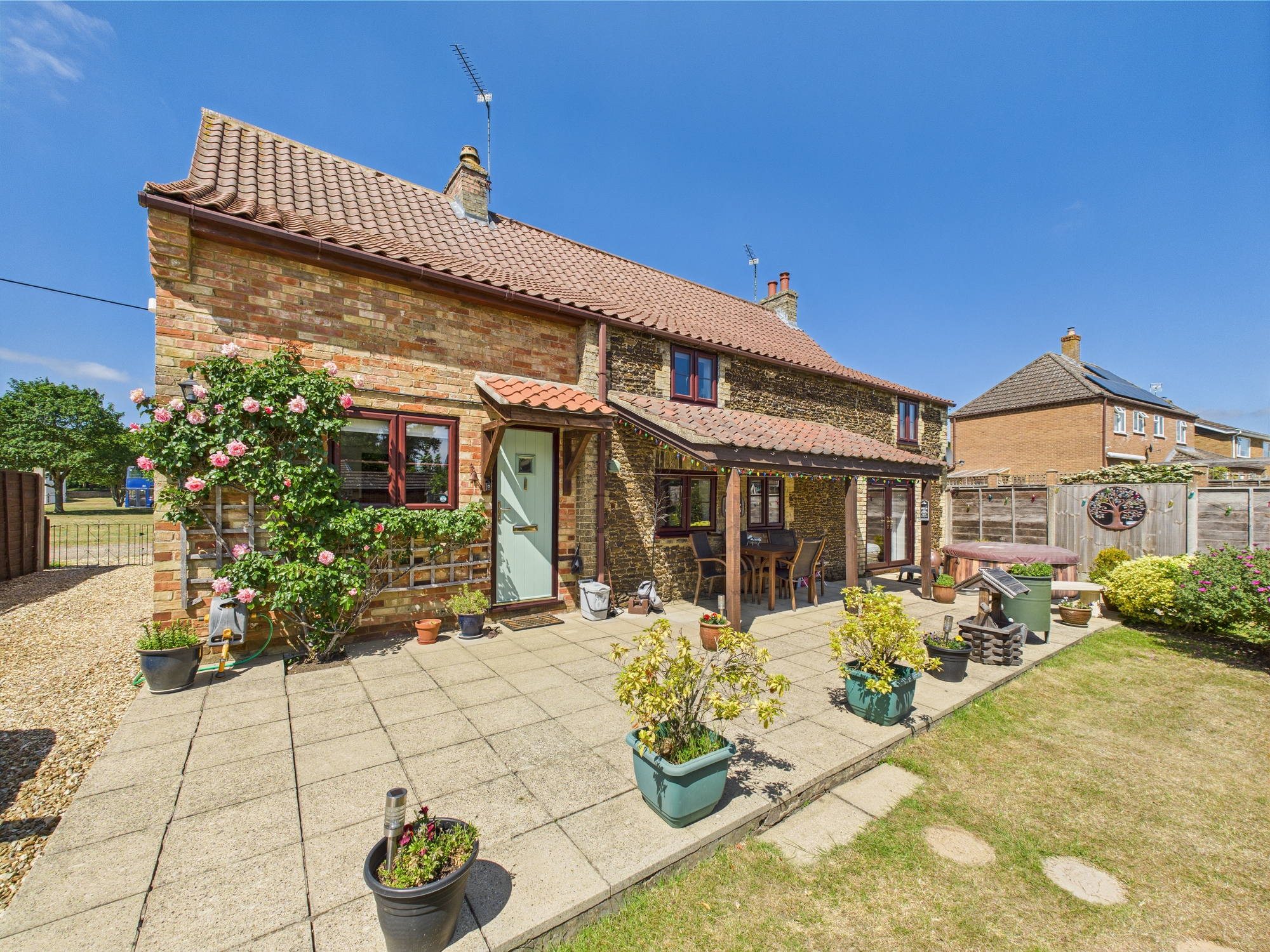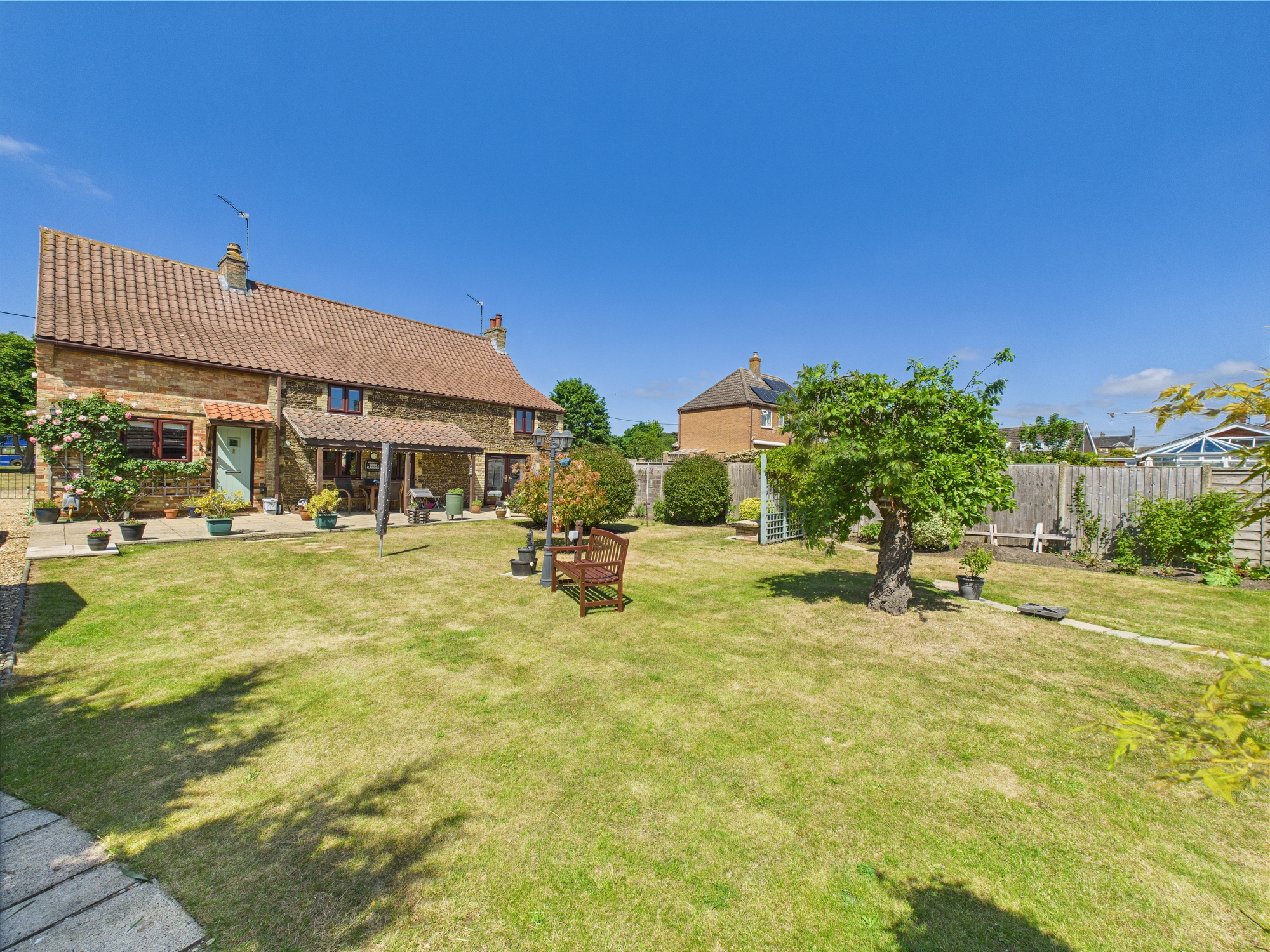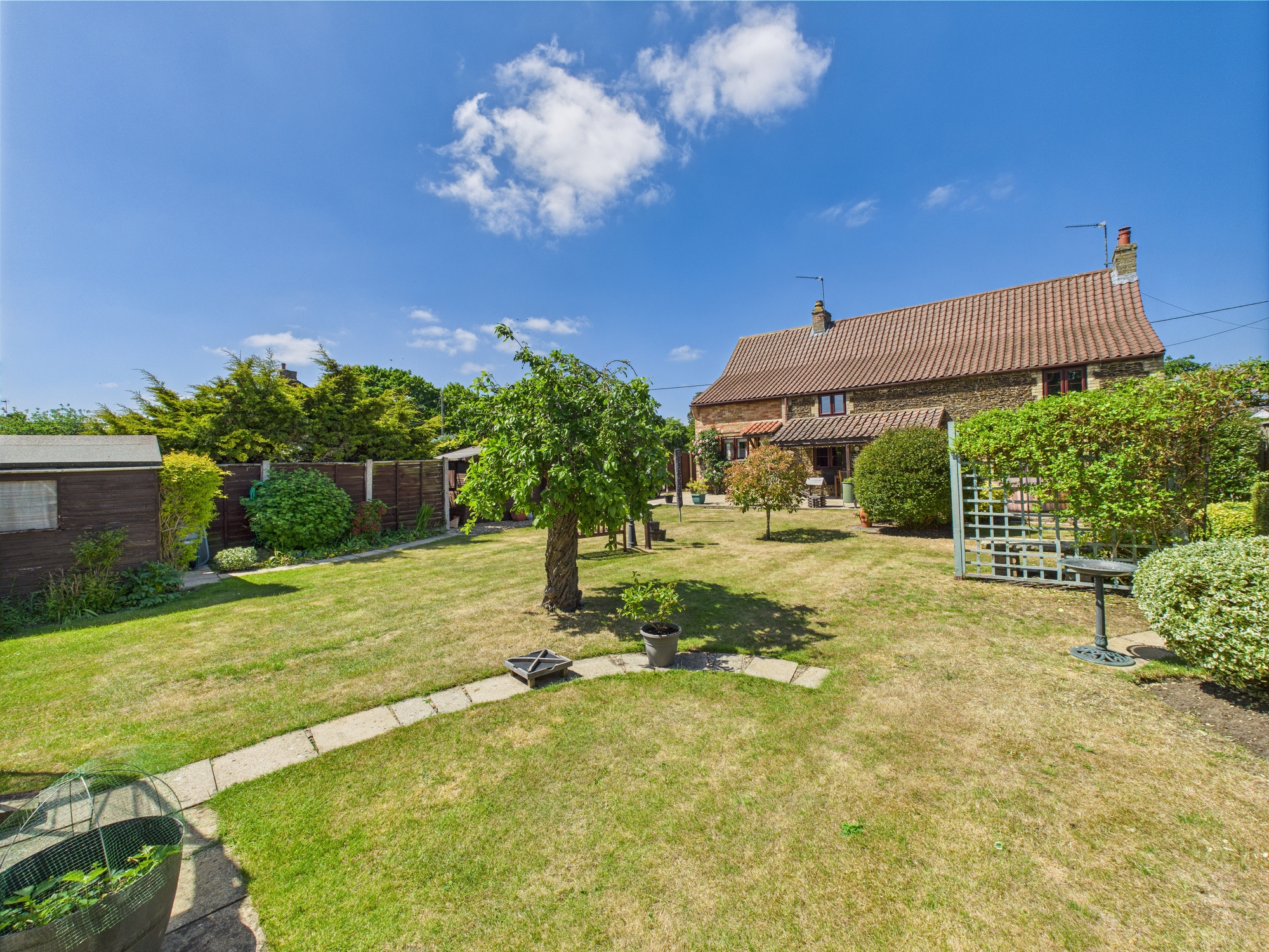 The front of the property is laid to shingle with bushes and shrubs inset with an original wall to the boundary. The shingle continues to the side providing off road parking. The rear garden is mainly laid to lawn with a patio and covered seating area, wooden storage sheds/outbuildings and a greenhouse all enjoying a southern aspect.