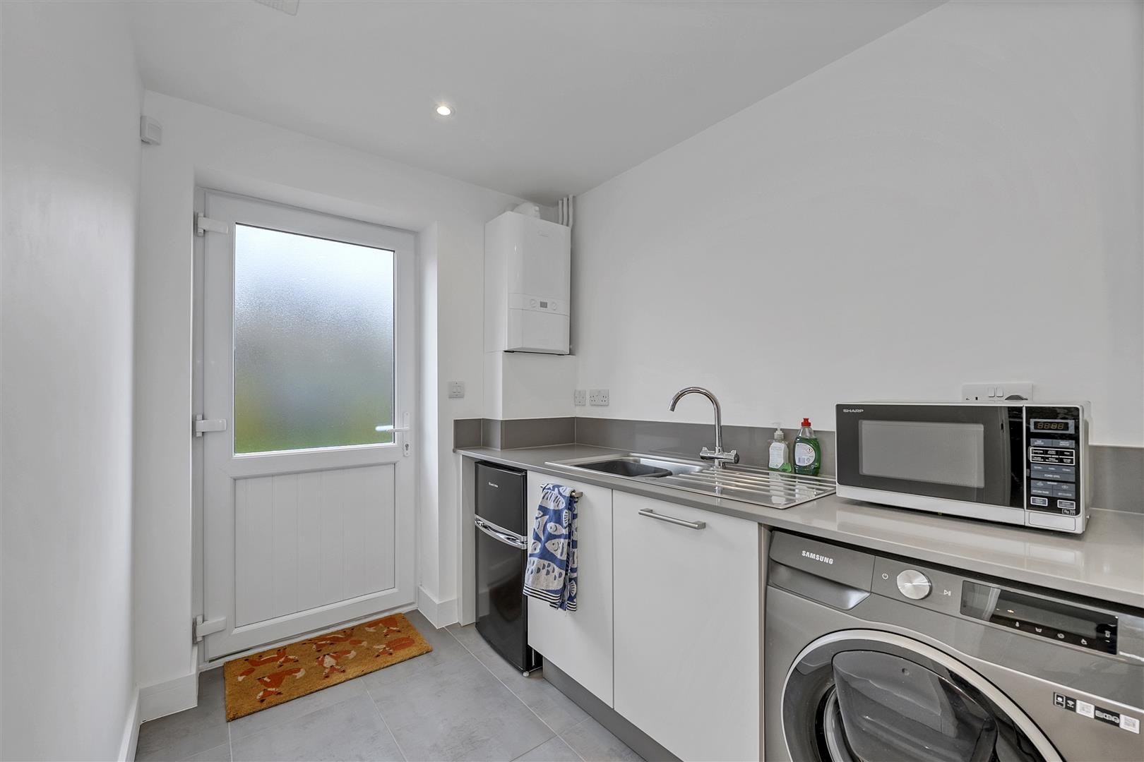 Fitted with base storage units together with full height storage cupboard with working top surfaces over, stainless steel sink with drainer and mixer tap over, space and plumbing for washing machine, space for under counter fridge/freezer or tumble dryer, wall mounted boiler, recessed ceiling lighting, tiled flooring, door leading out to rear garden.