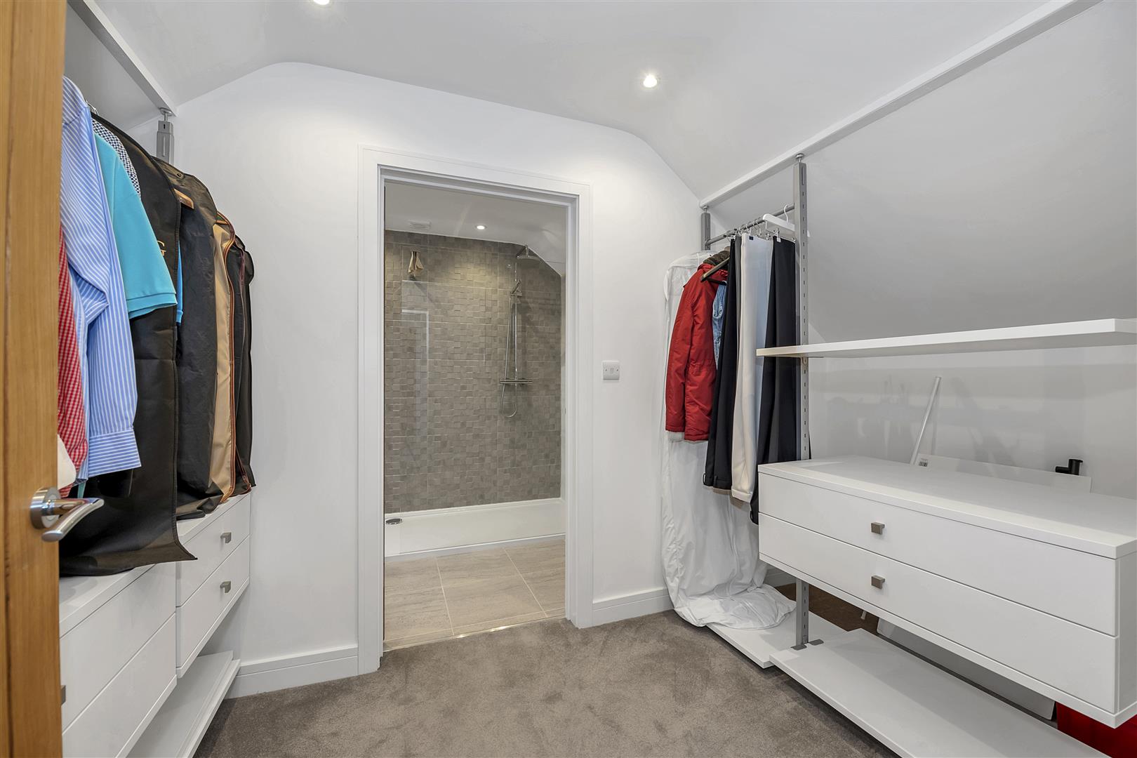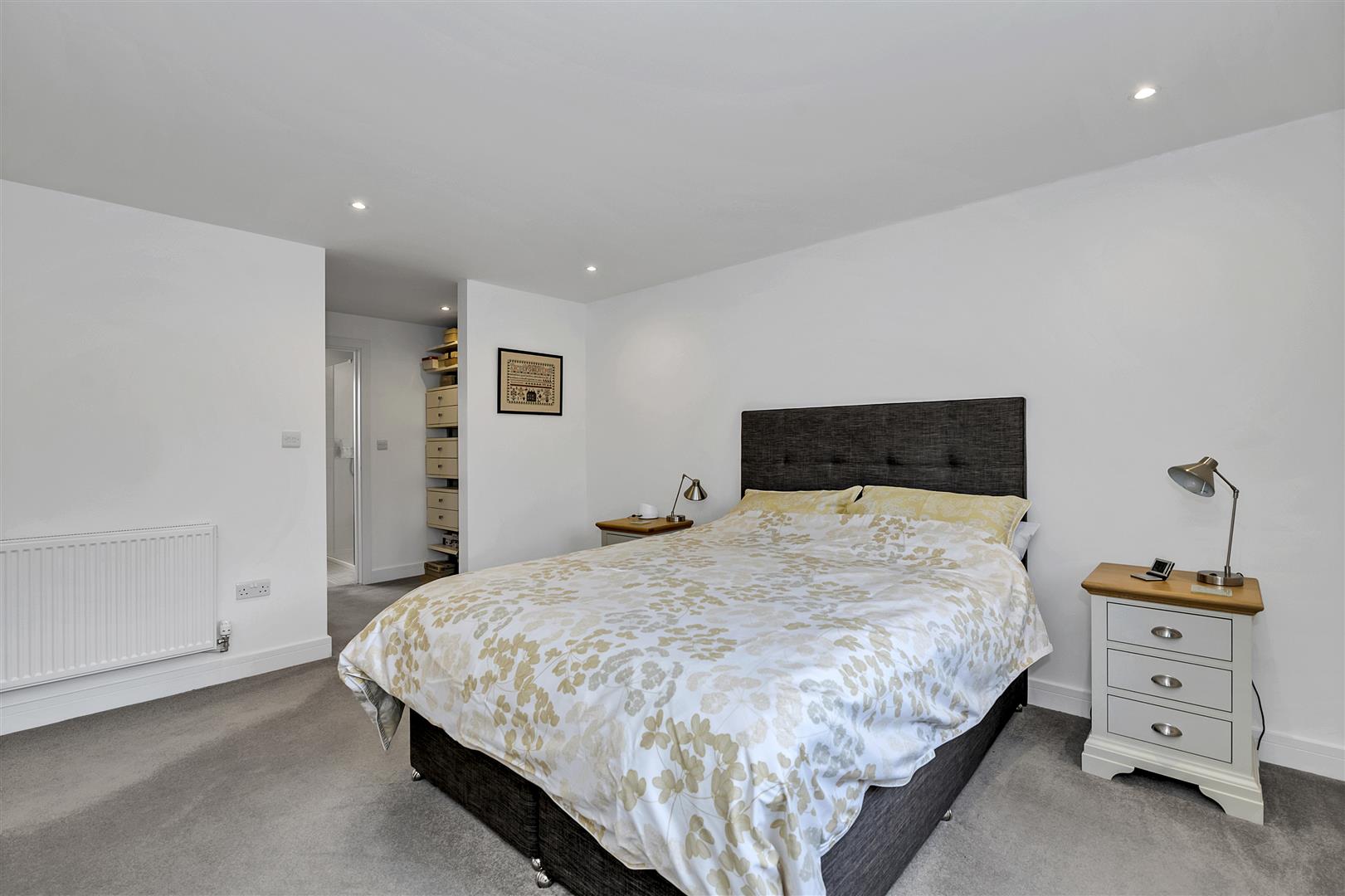 With window to the front aspect, radiator, recessed ceiling lighting, carpeted flooring, walk through dressing room with storage to both sides, door to: