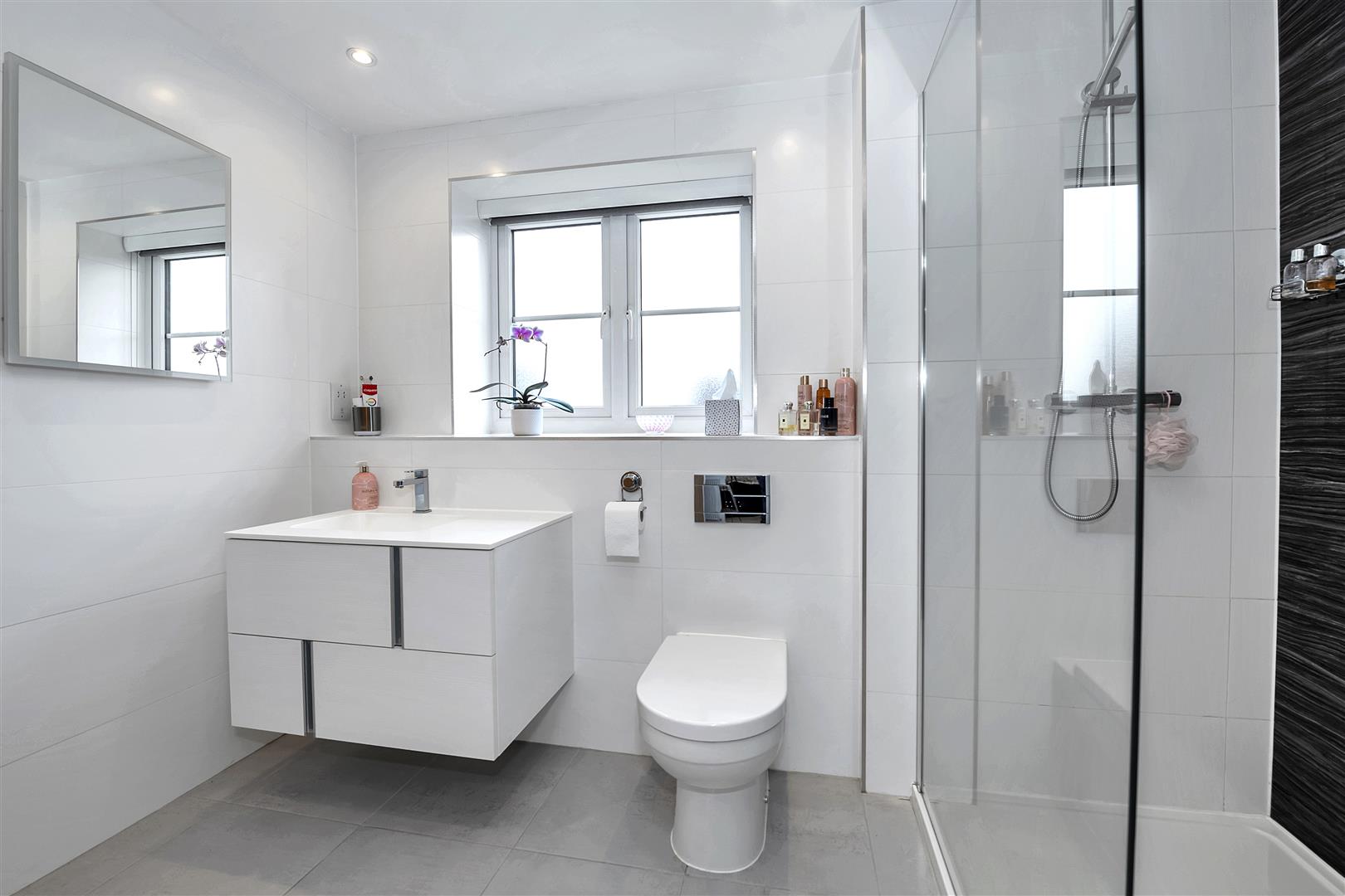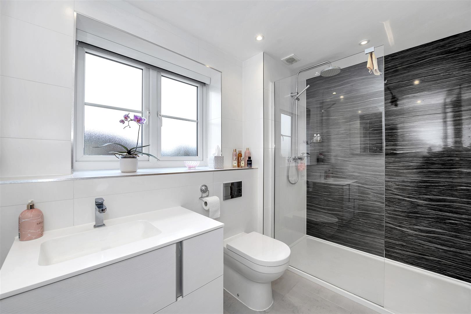 Suite comprising concealed unit WC, hand wash basin built into vanity surround, walk in shower with drench head, handset and glass screen, fully tiled walls, tiled flooring, ladder radiator, illuminated mirror, recessed ceiling lighting and obscured window to the rear aspect.