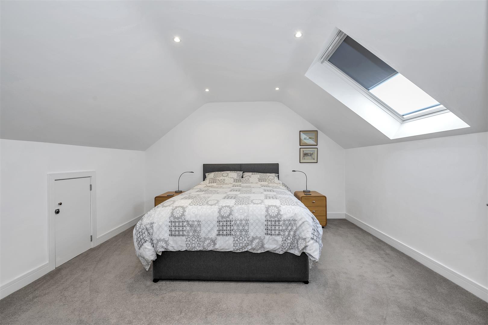 Velux window to the rear aspect, radiator, fully carpeted, recessed ceiling lighting and access to eaves storage.