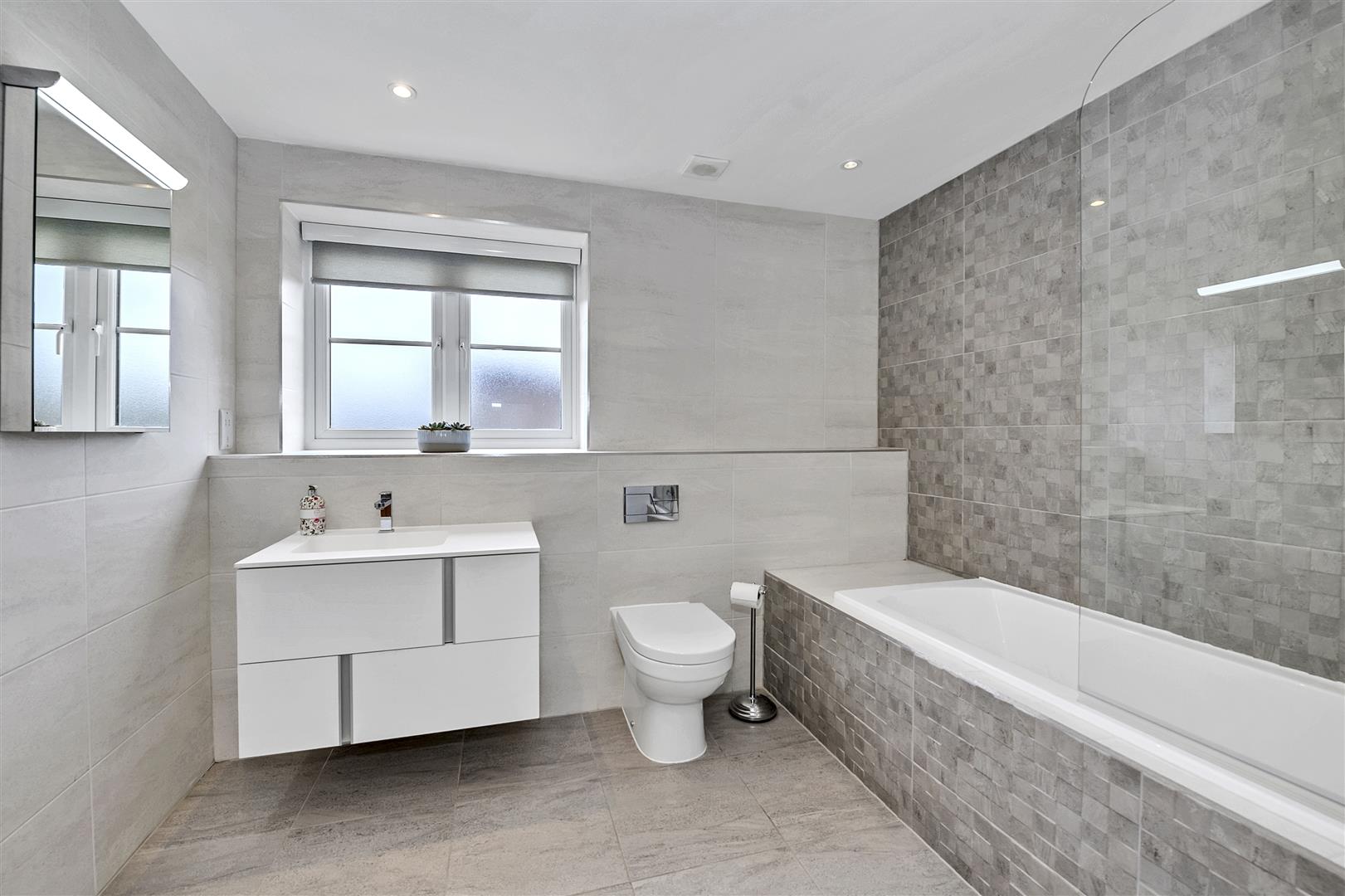 Suite comprising concealed unit WC, hand wash basin built into vanity surround, bath with shower attachment and screen, fully tiled walls, tiled flooring, obscured window to the rear aspect, illuminated mirror, ladder radiator and recessed ceiling lighting.