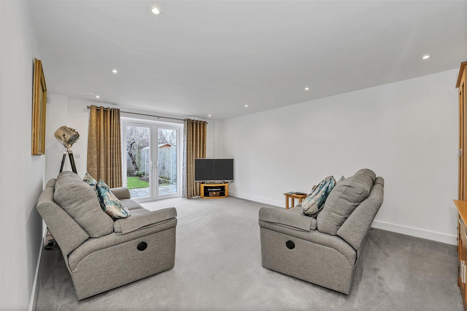 TV and Sky aerial connection points, recessed ceiling lights, carpeted flooring, windows to the rear aspect and French style doors opening out onto the rear garden.