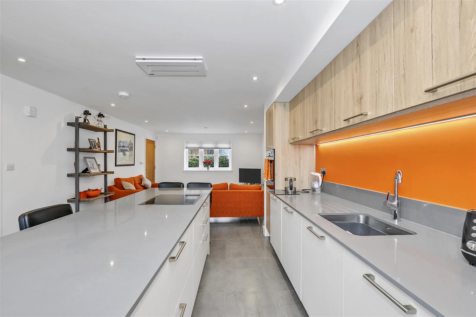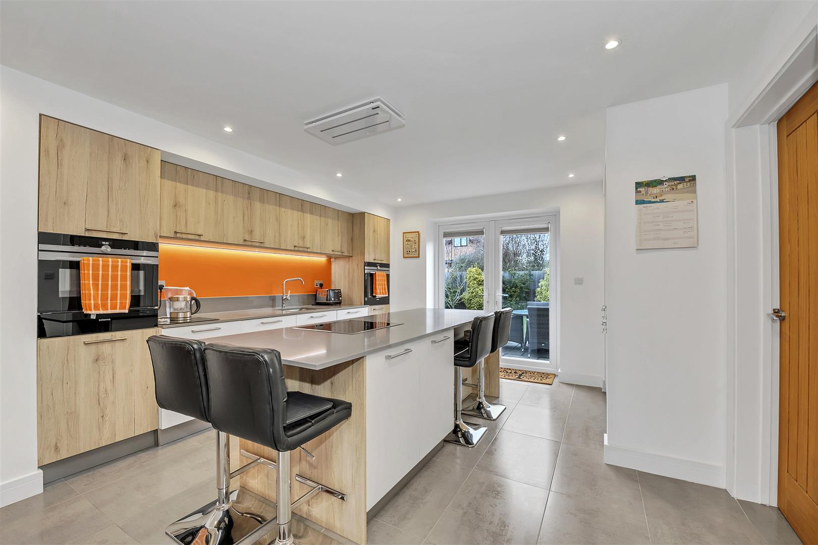 The kitchen is fitted with a modern range of eye level, base and island storage units with working top surfaces over, undermounted stainless steel sink with mixer tap over, twin built-in Siemens electric ovens (one with Microwave), separate induction hob and extractor above, integrated appliances, under cupboard lighting, recessed ceiling lights, tiled flooring, window to the front aspect and French style doors opening out onto the rear garden.