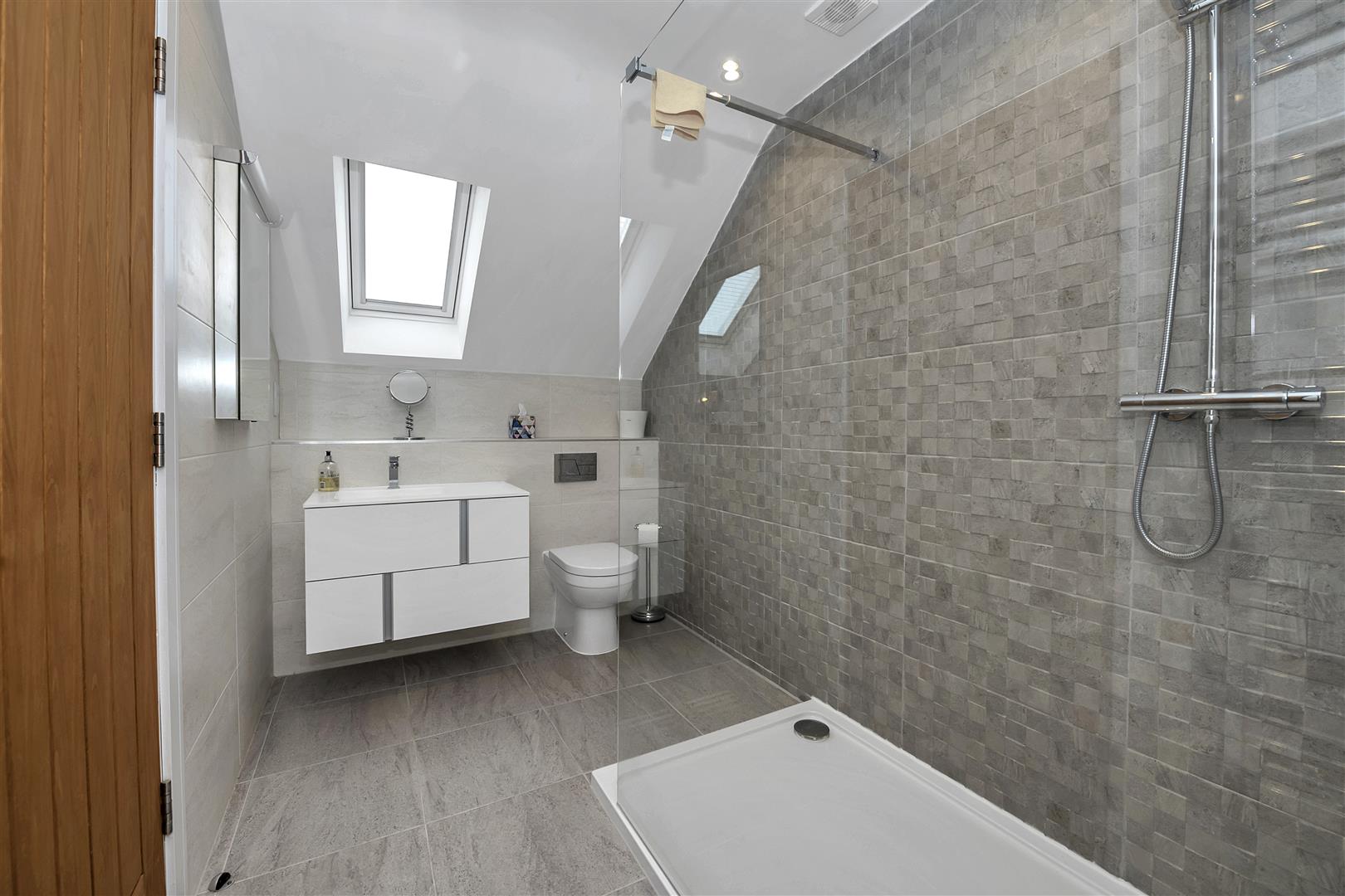 Suite comprising concealed unit WC, hand wash basin built into vanity surround, walk in shower with drench head, handset and glass screen, fully tiled walls, tiled flooring, ladder radiator, illuminated mirror, storage area, recessed ceiling lighting Velux window to the rear aspect.