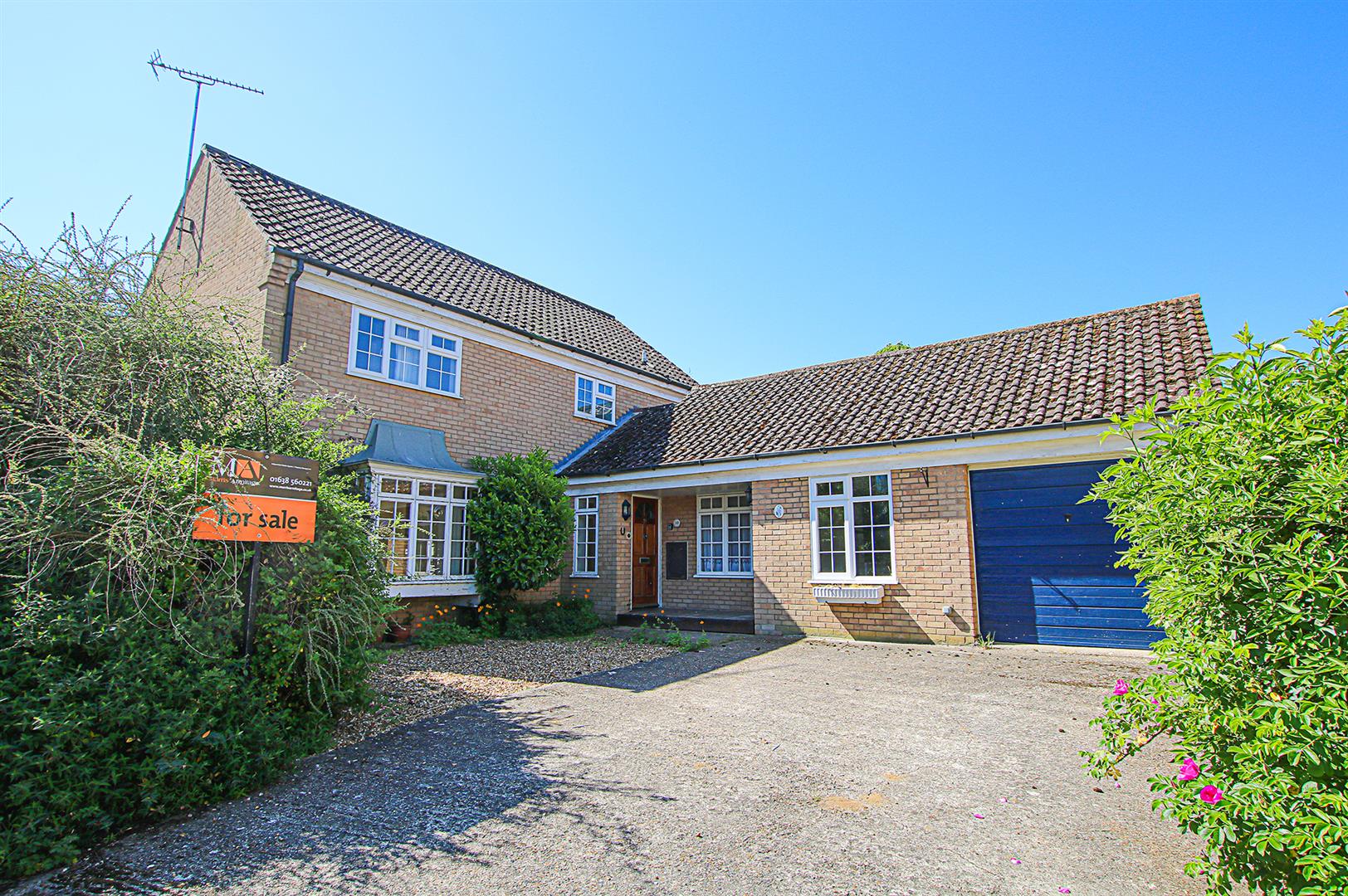 Hardstanding driveway leading to garage. Covered entrance leading to front door. Gravel bedding with mature shrub planting.