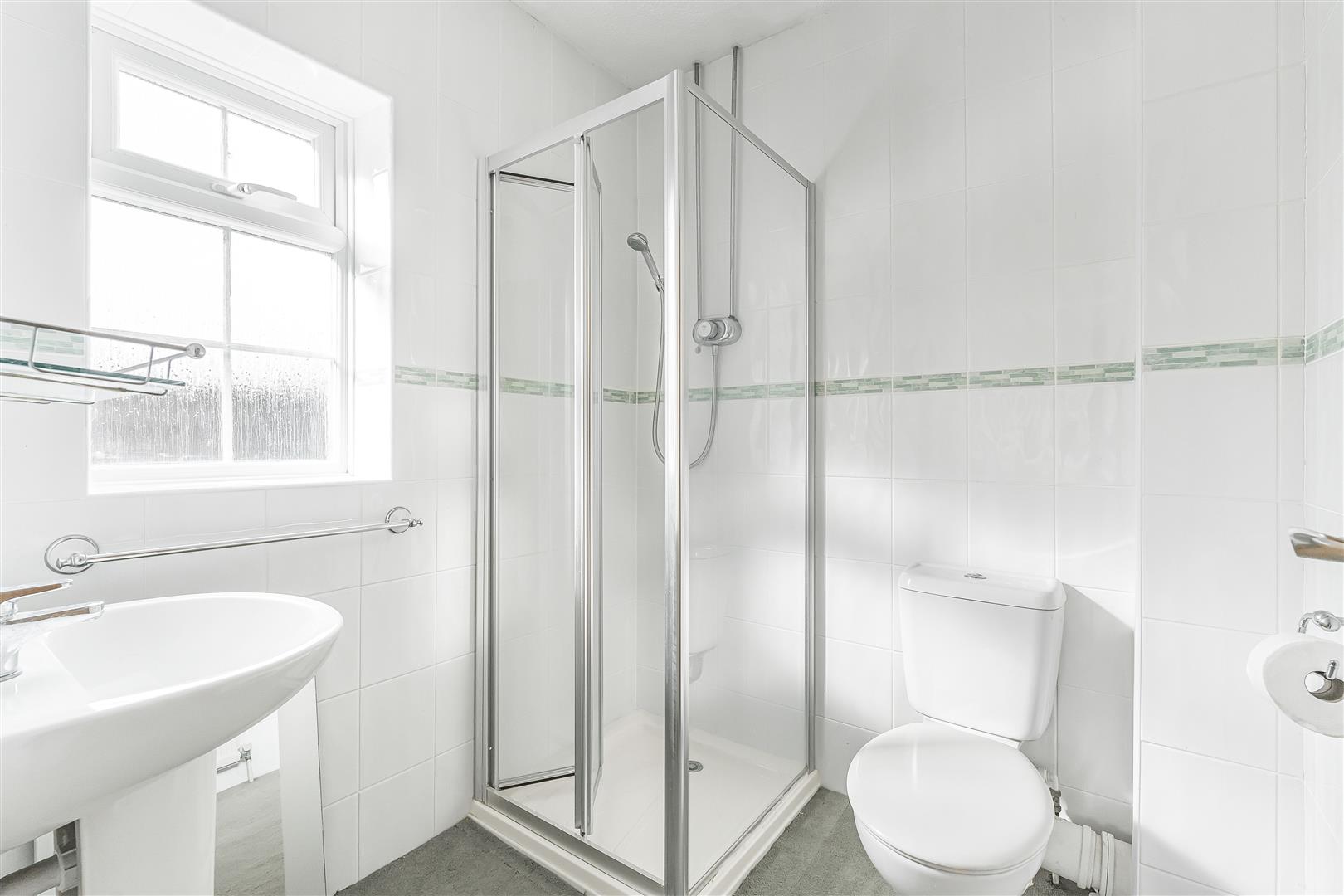 Modern en suite with white suite comprising low level W.C., pedestal handbasin with mixer tap over and walk-in shower cubicle with wall mounted shower. Attractively tiled. Obscured window. Door to Bedroom 1.