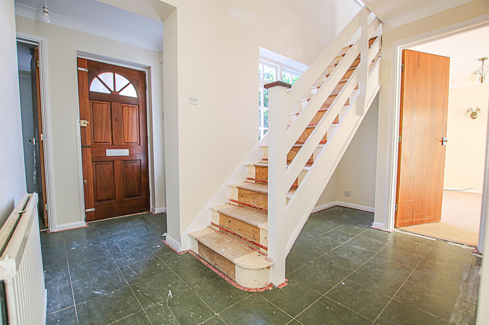 Spacious entrance hall with opening to kitchen. Doors leading to living room, dining room, snug/study and cloakroom. Dual windows overlooking front aspect. Radiator. Stairs to first floor.