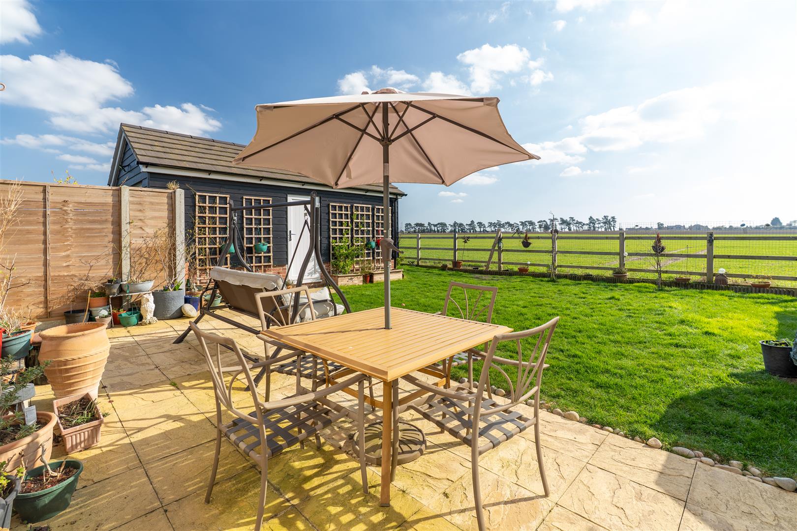 Mainly laid to lawn with patio seating area to the rear of the house. Further patio area adjacent to garage. Raised beds. Lovely views over surrounding fields. Door to garage. French doors to living room. Access gate to front driveway.