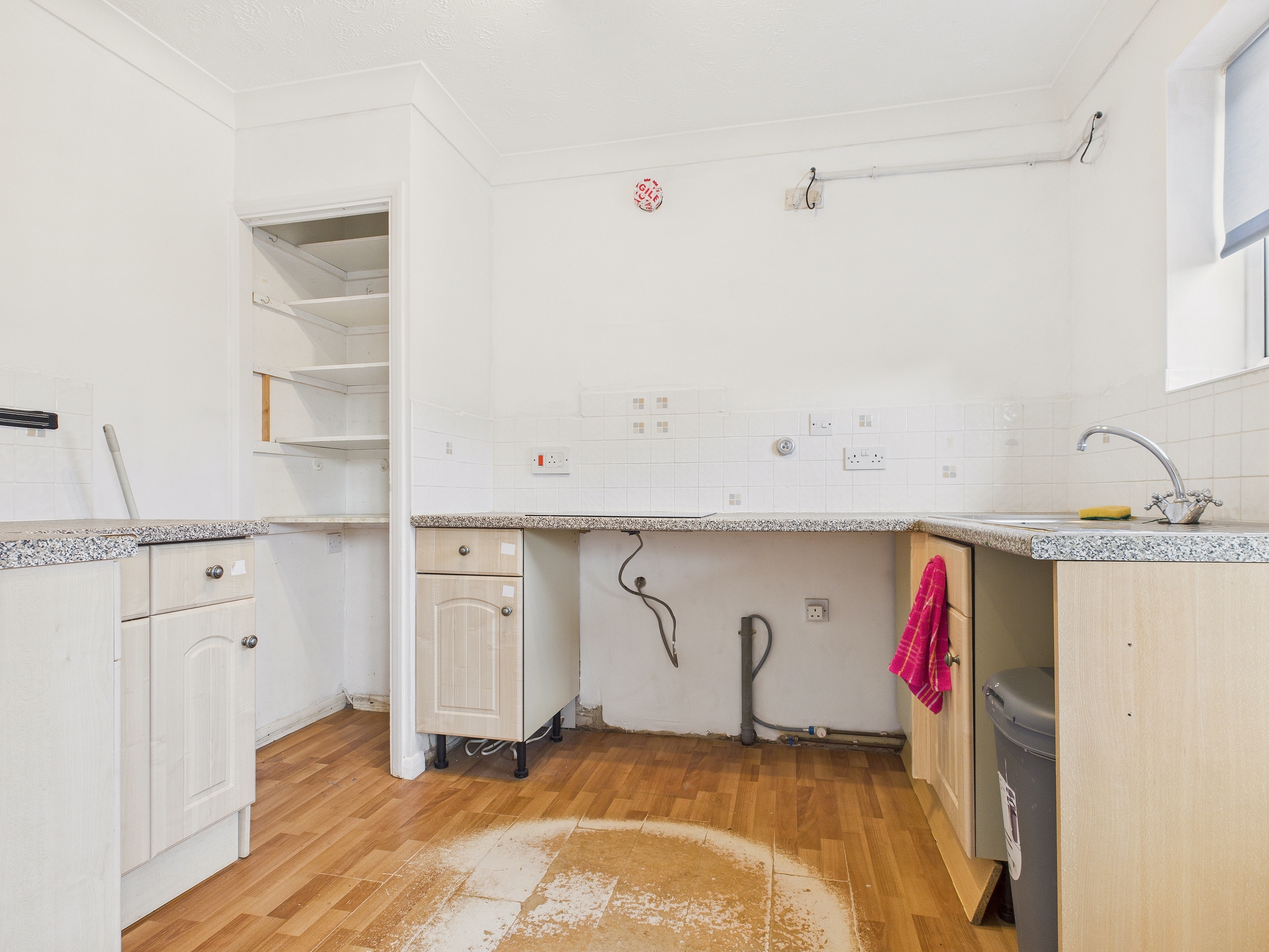 uPVC double glazed window to rear, uPVC double glazed door to rear, base units under round edge worksurfaces, stainless steel sink drainer with mixer tap over, 4 ring electric hob, space for washing machine, space for fridge/freezer, pantry cupboard, laminate style flooring, textured and coved ceiling.