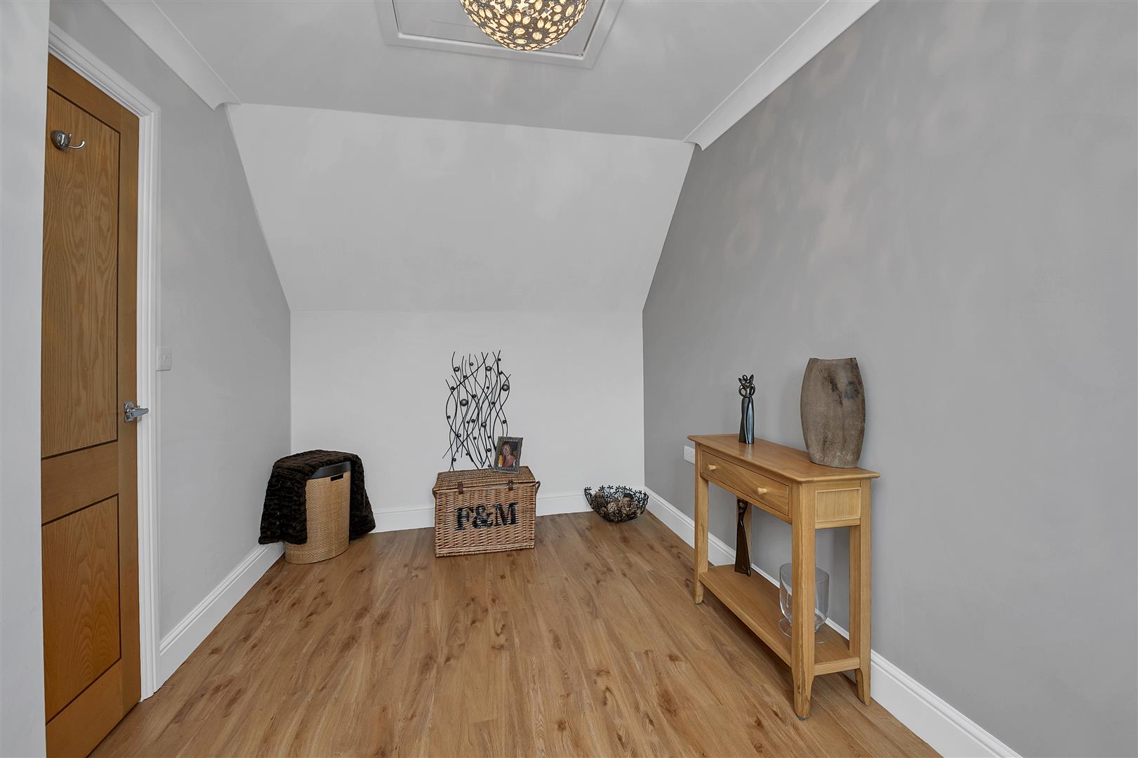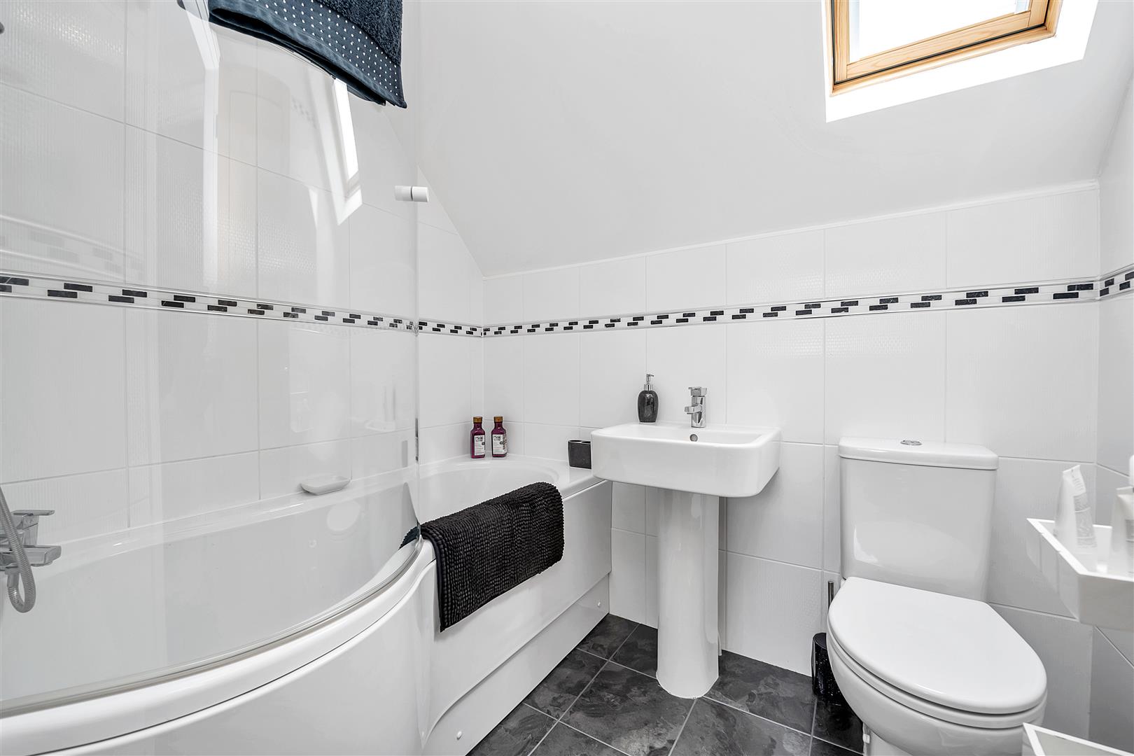 With suite comprising panel bath with shower attachment/mixer taps and glass screen, hand wash basin, low level WC, heated towel rail, part tiled walls, tiled flooring, Velux window.