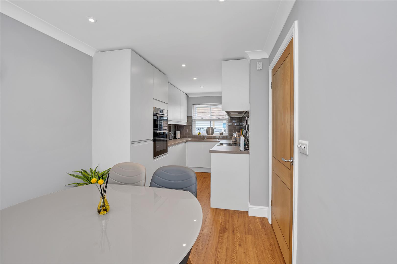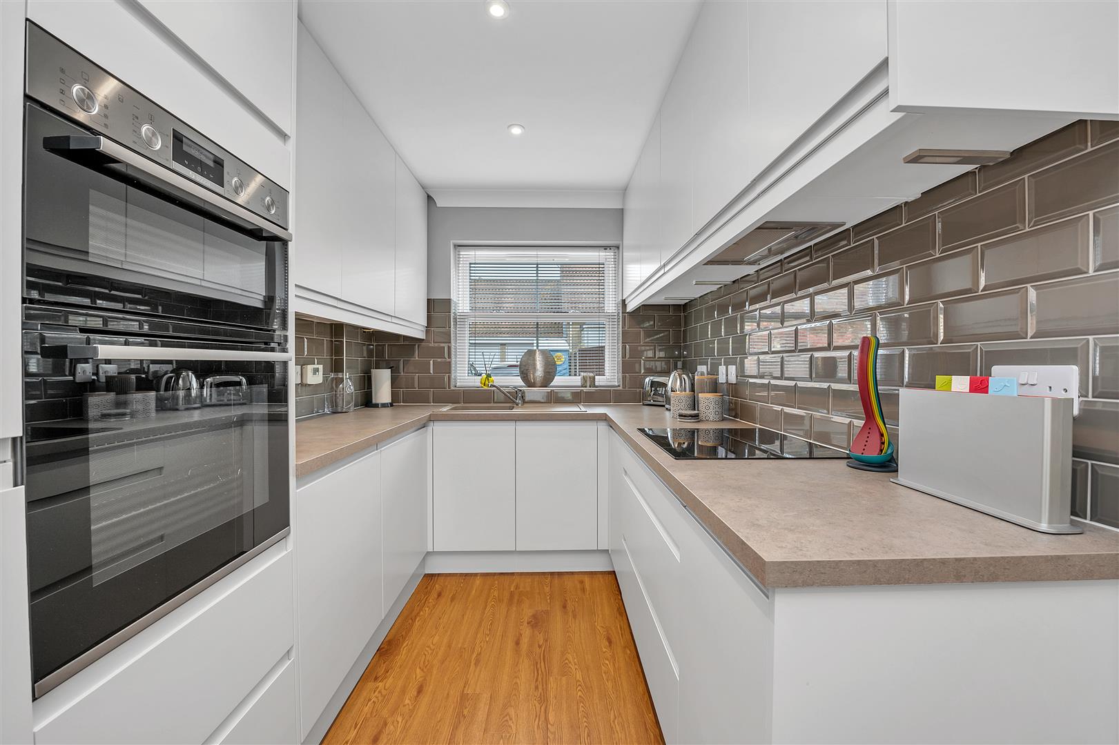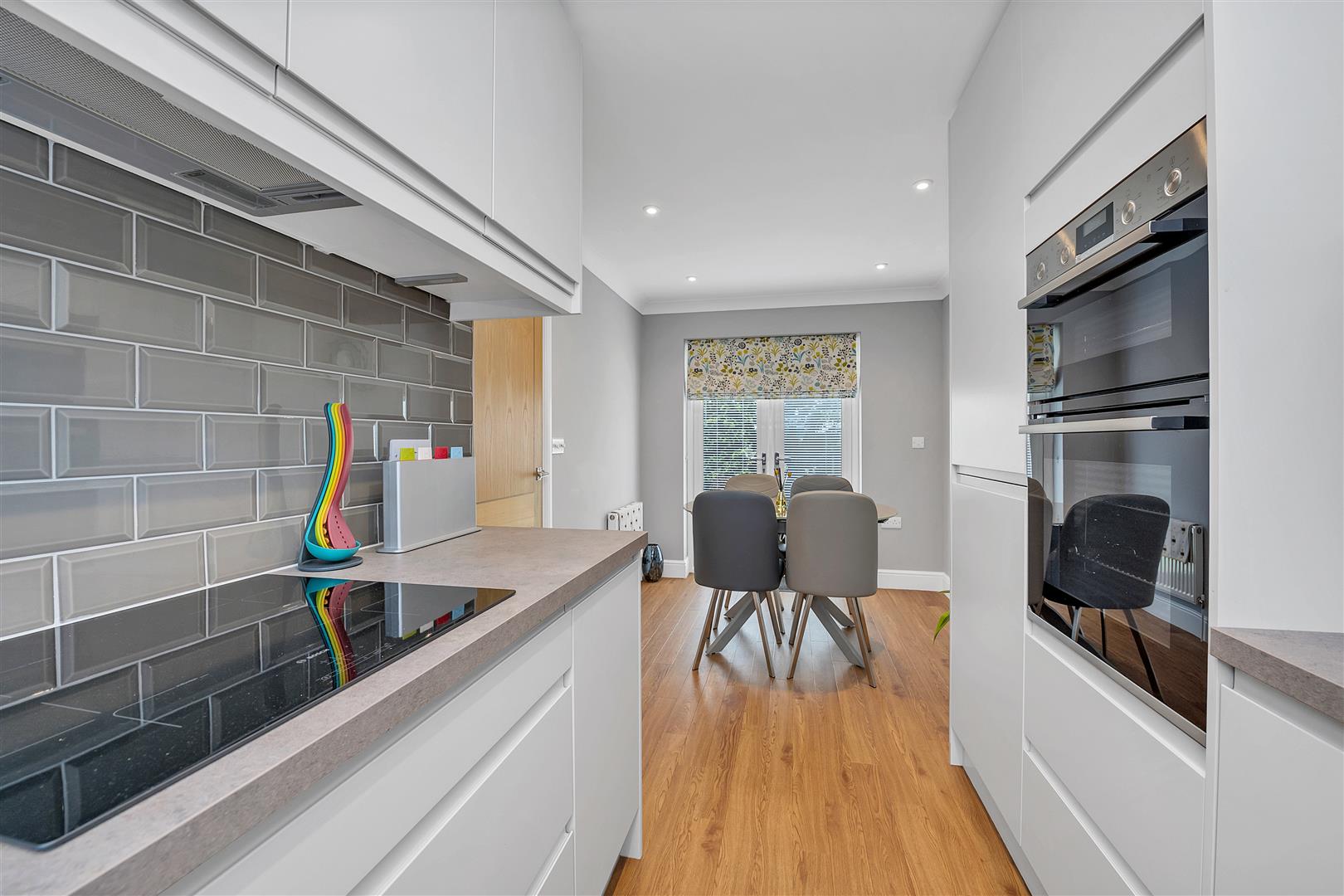 With integrated fridge/freezer and oven, base and eye level cupboards with under lights , ceramic hob, inset sink unit with mixer tap over, tiled splashbacks, engineered wood flooring, radiator, window to the front aspect and French style doors leading to the rear garden.