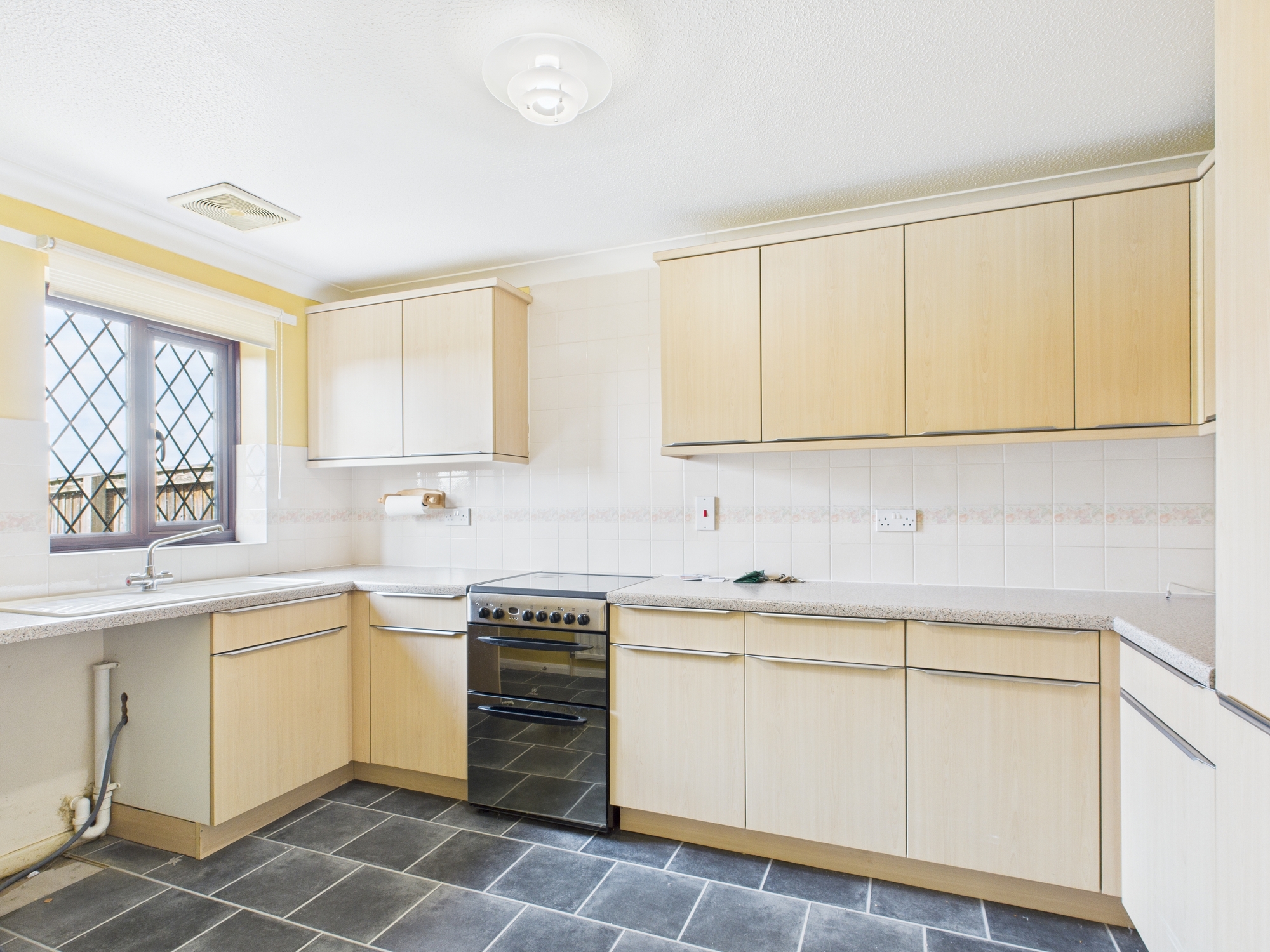 uPVC double glazed window to the rear, generously fitted with a range of matching wall and base units with round edge worksurfaces over, inset sink and drainer, space for cooker and washing machine, single panel radiator, part glazed uPVC door to rear.