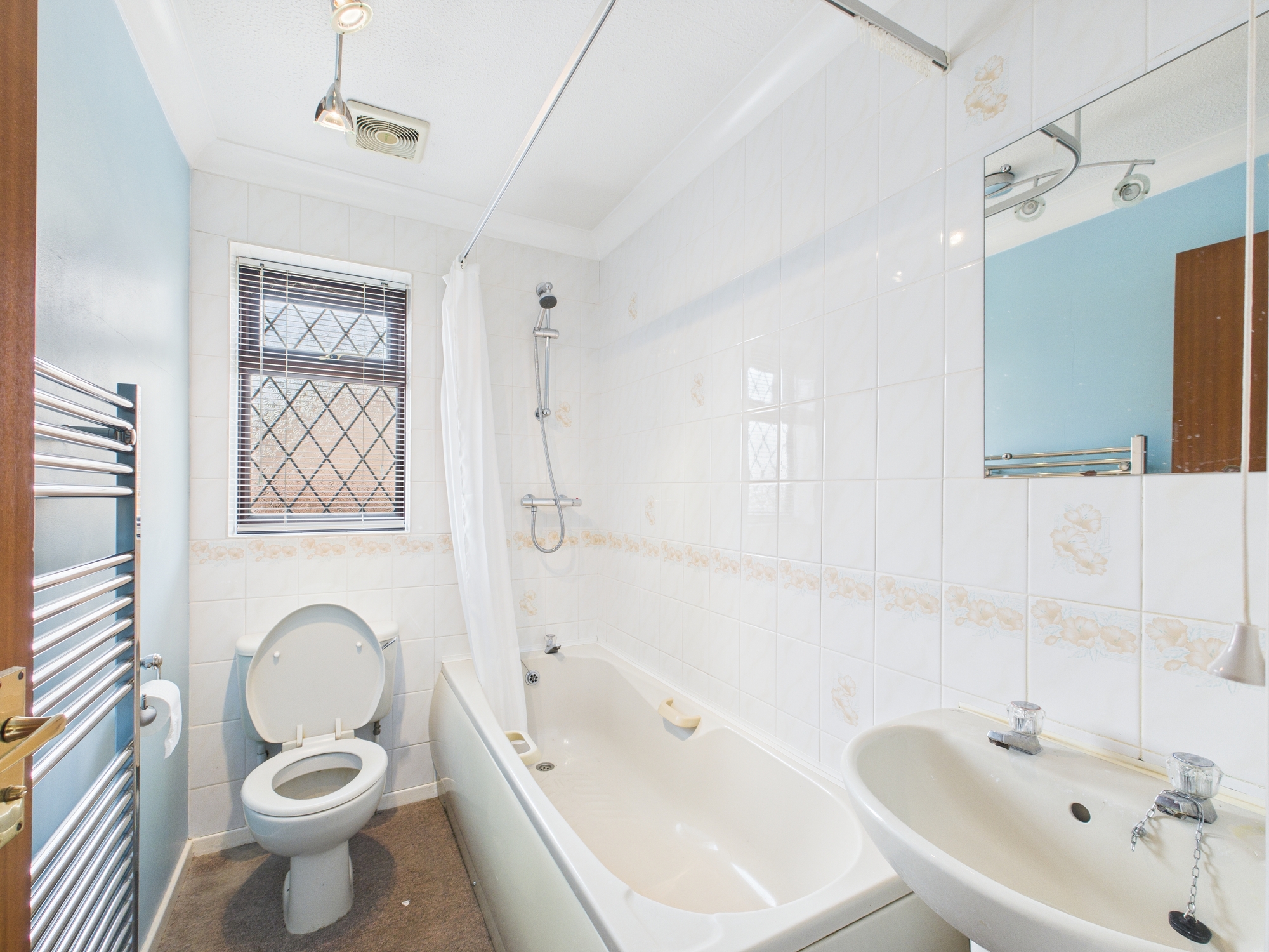 uPVC double glazed window to the rear, panelled bath with shower over, pedestal handwash basin, low level w.c., half tiling to walls, wall mounted chrome style towel radiator, ceiling extractor.