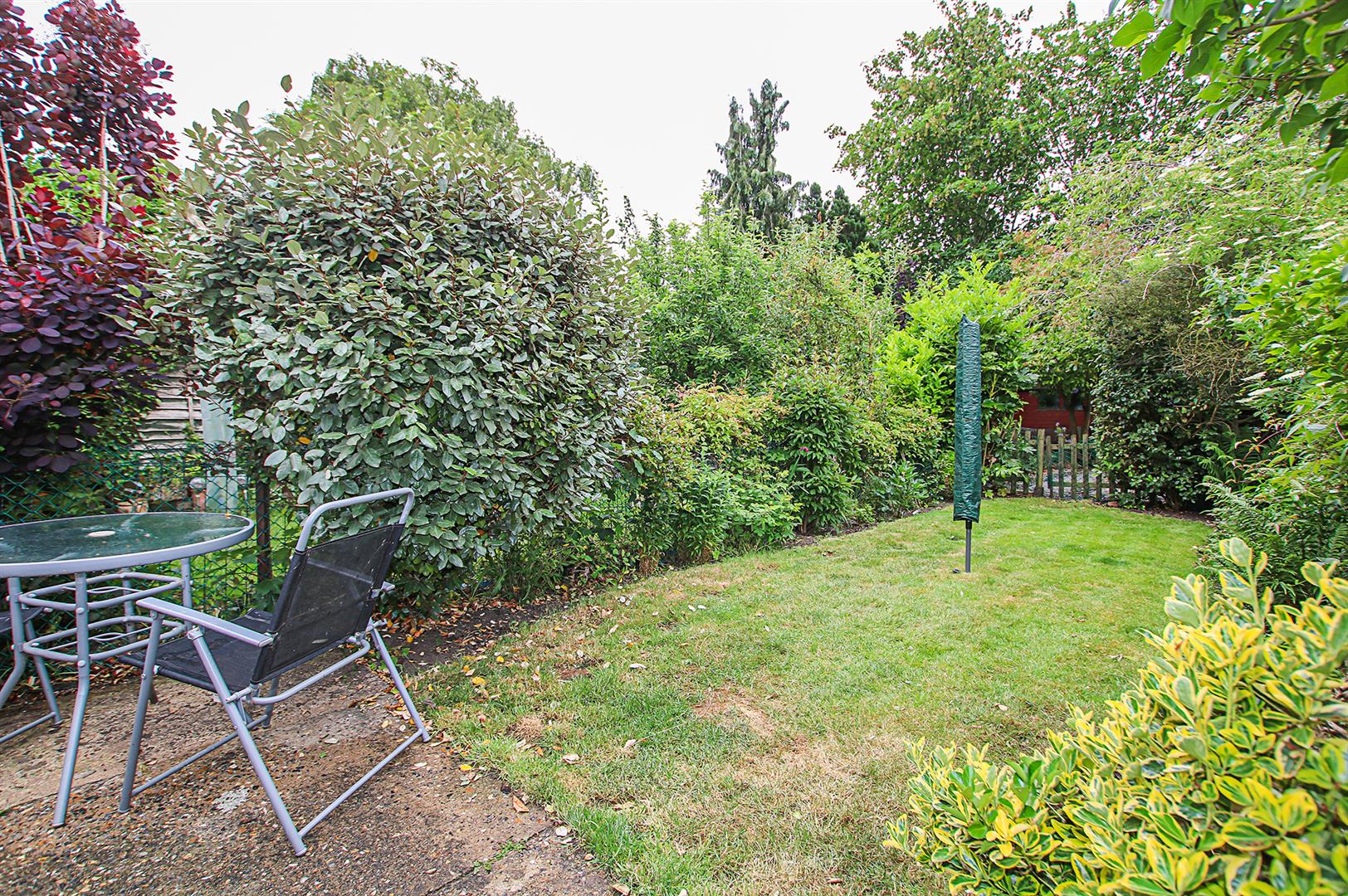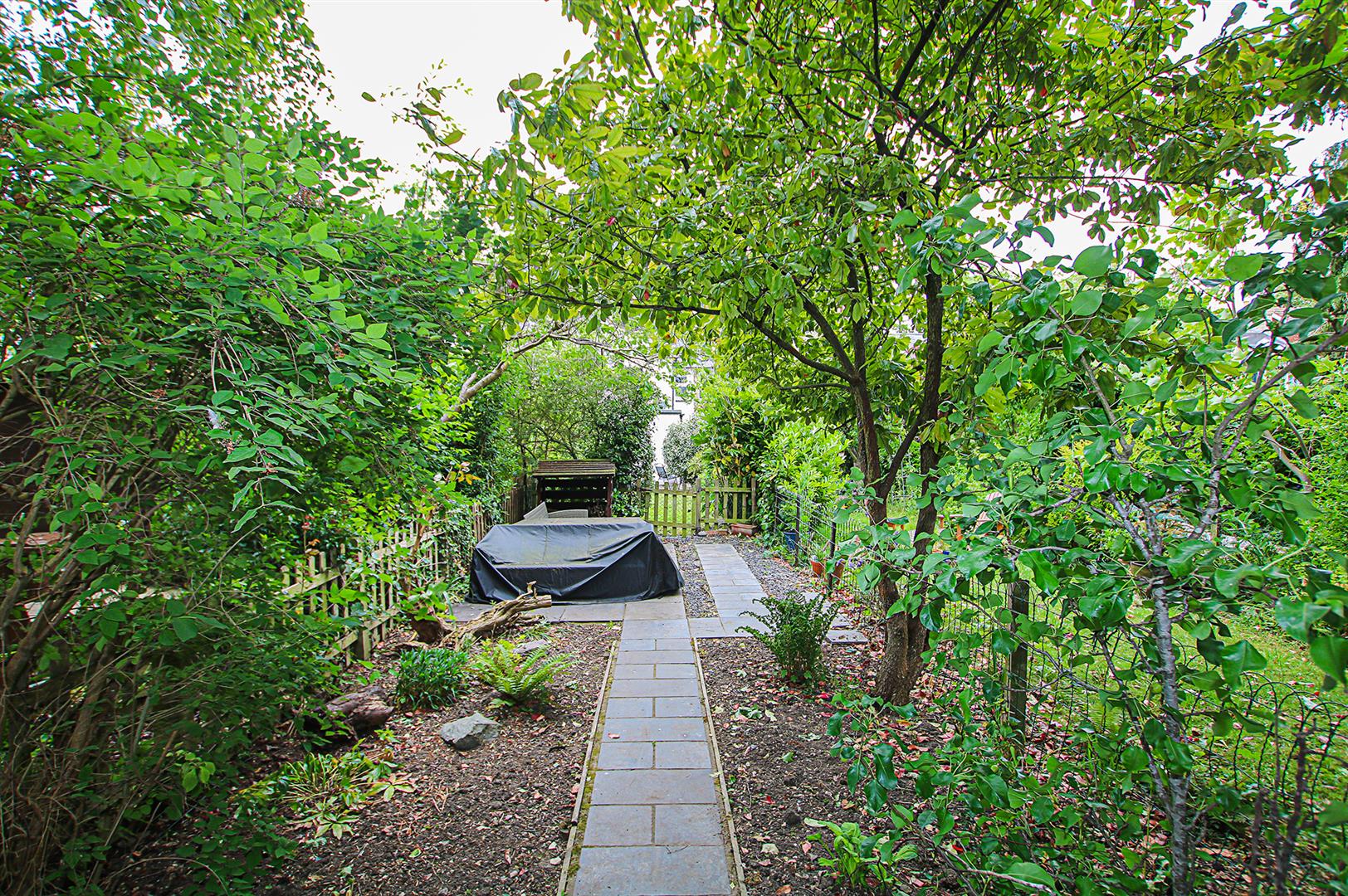 Charming rear garden with patio and lawn area, with mature shrub panting, to rear of house, following to a 'woodland' area with central pathway leading to brick built out building. Access gate to rear.