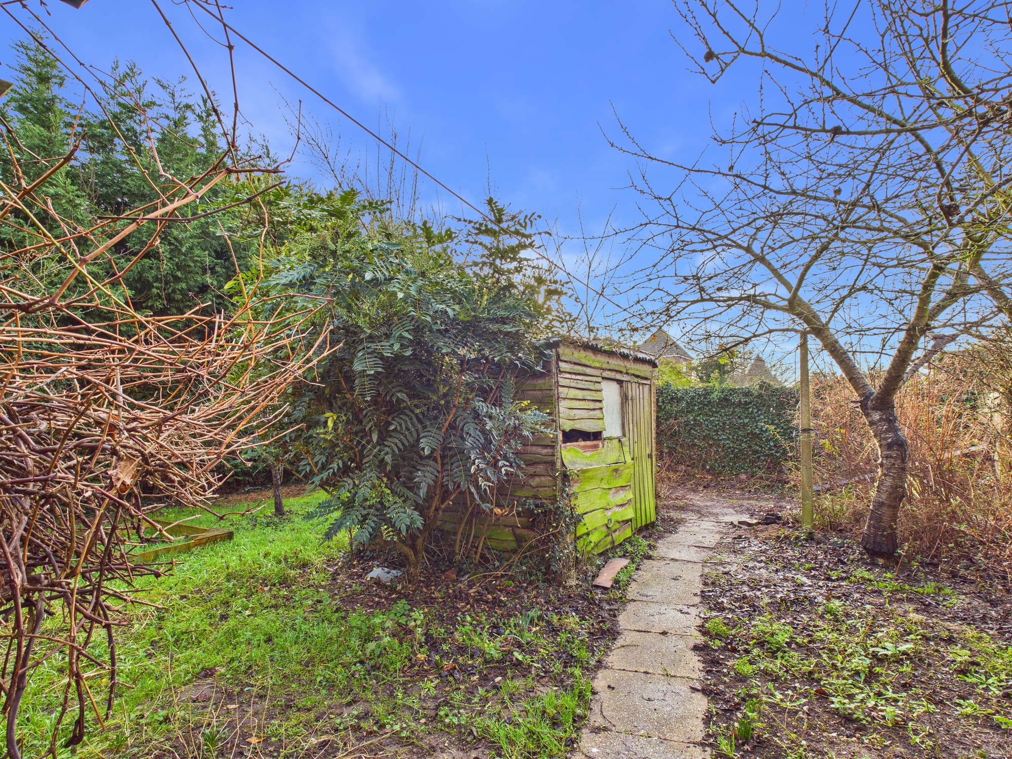 To the front of the property there is a mature garden with pathway leading to the entrance door. To the rear of the property it is mainly laid to lawn with mature shrubs and trees with a covered patio area along with a timber and brick storage outbuilding. The gate to the rear leads to a pathway which is shared with neighbouring properties and provides an area for bin storage.