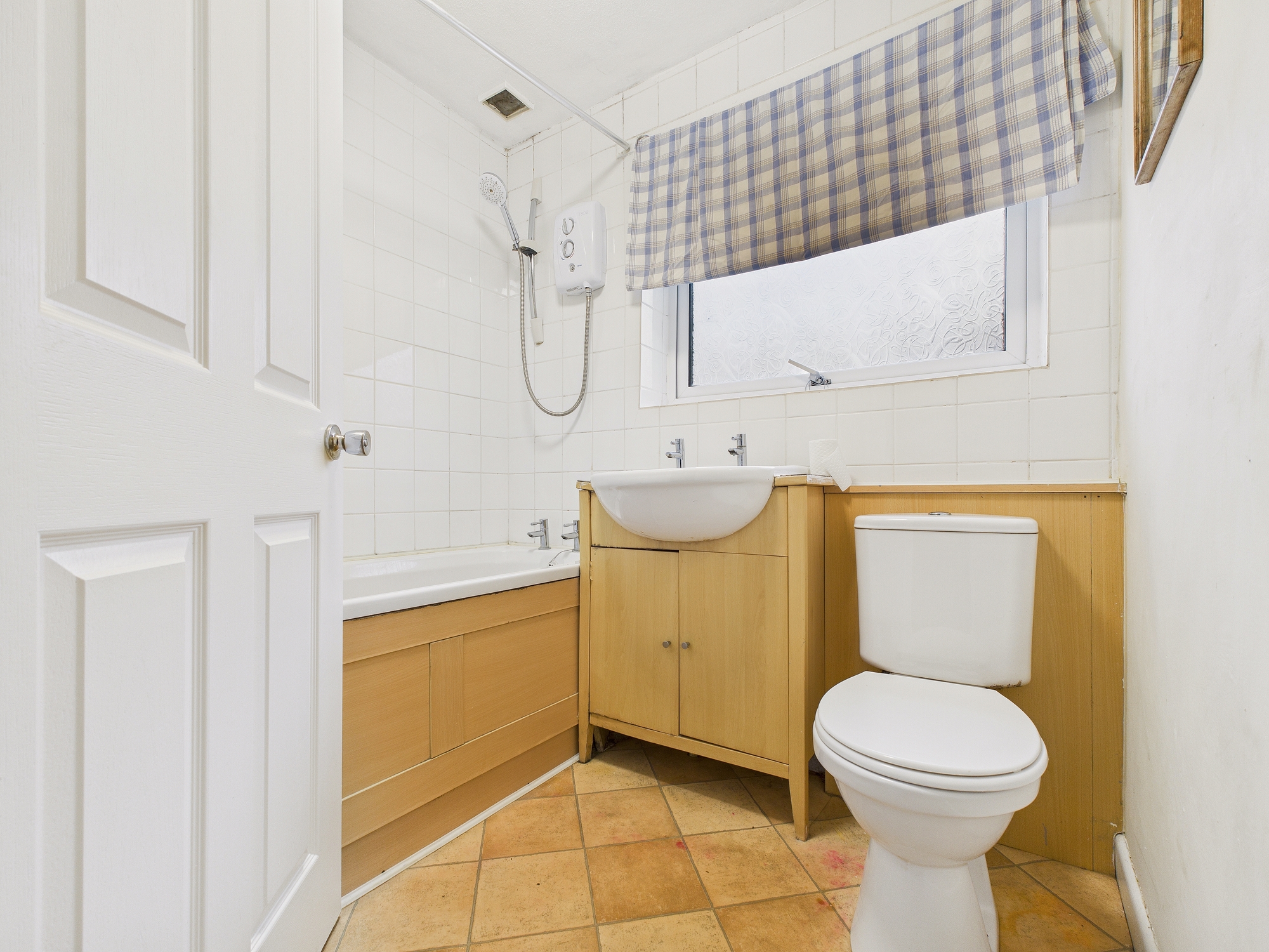 Low level w.c., handwash basin set into vanity storage unit, uPVC double glazed window to front, bath with electric shower over, heated towel radiator.