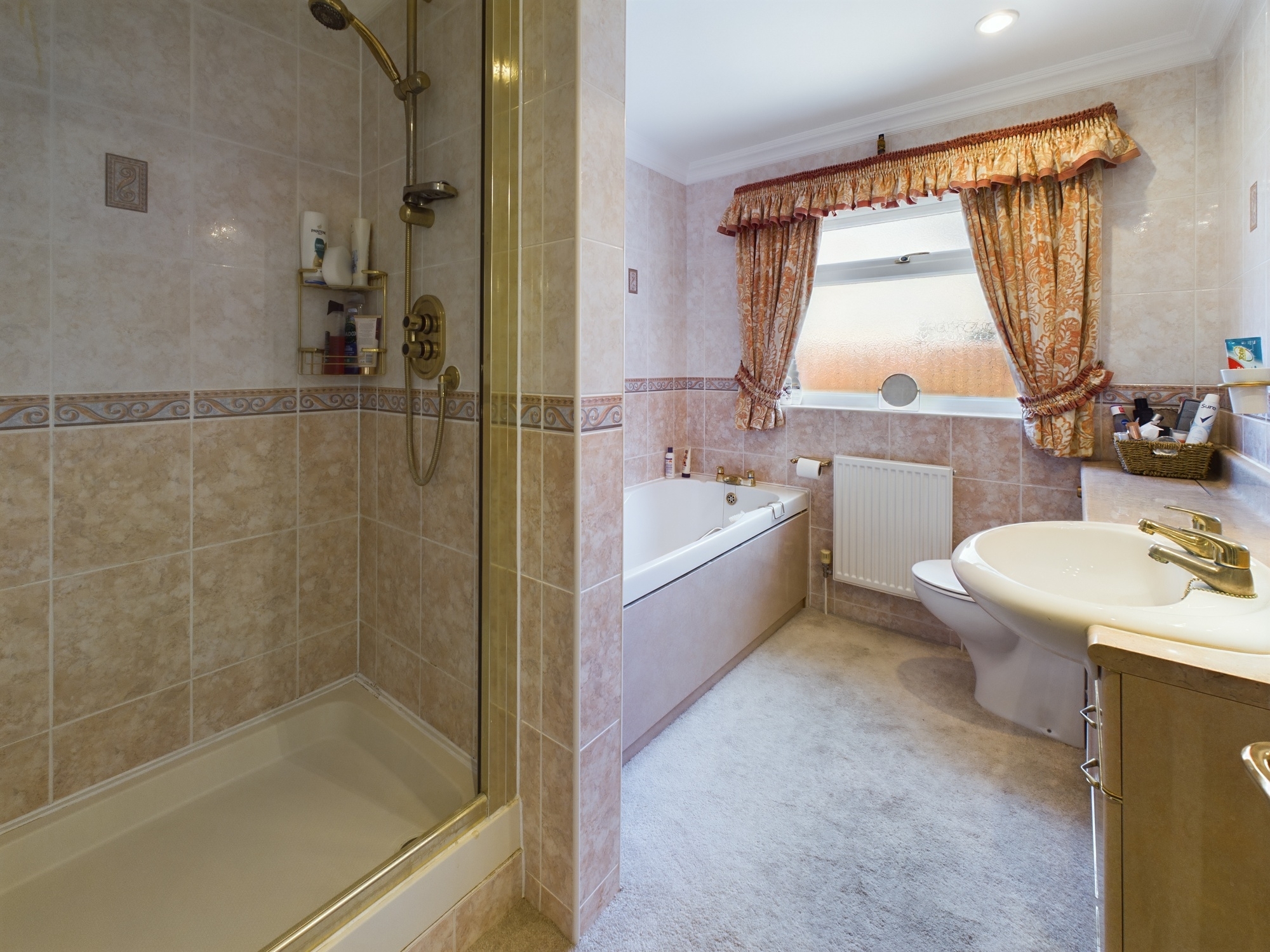 uPVC double glazed window to side aspect, shower cubicle, bath with mixer taps, low level w.c., hand washbasin set in vanity storage unit, towel radiator, radiator, fully tiled walls.