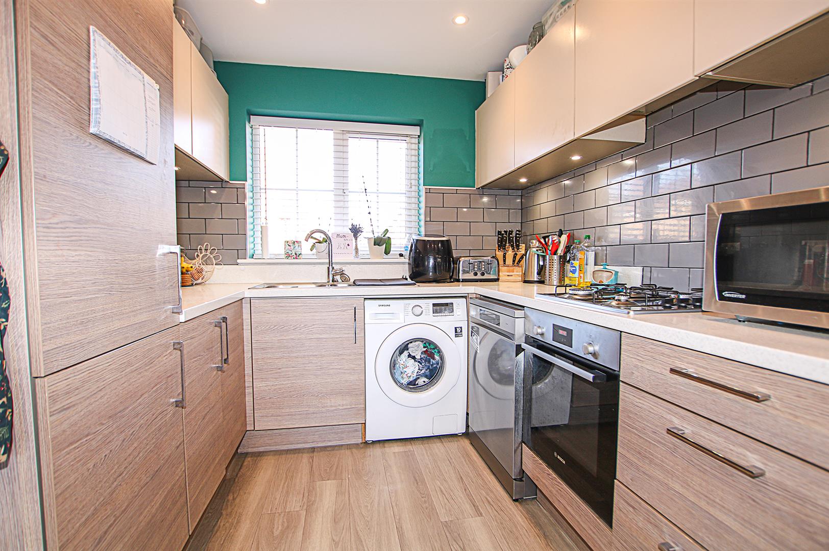 Fitted with a range of matching eye and base level storage units and working surfaces over, tiled splashback areas, inset stainless steel sink and drainer with mixer tap, integrated BOSCH oven and gas burner hob with extractor hood above. Space and pluming for a fridge/freezer, dishwasher and washing machine. Laid wooden flooring, window to the front aspect and French doors out to the rear garden.