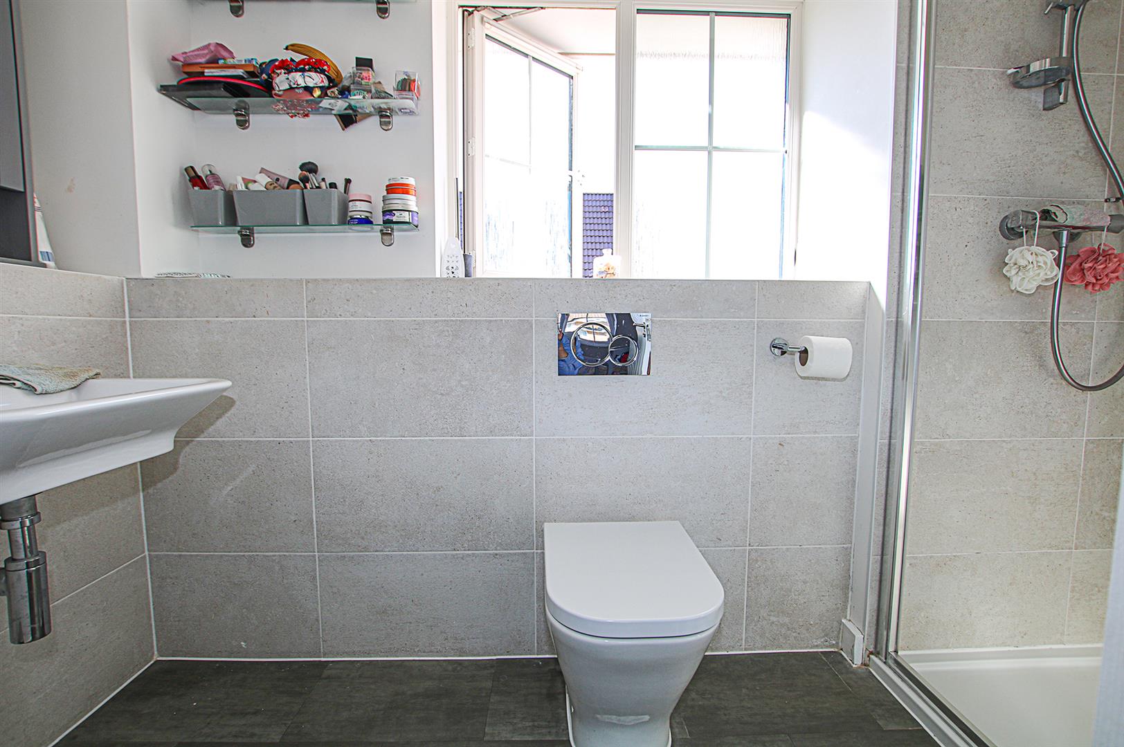 Ensuite comprising a concealed WC, hand basin, walk-in shower cubicle, part tiled walls, radiator and obscured window to the rear aspect.