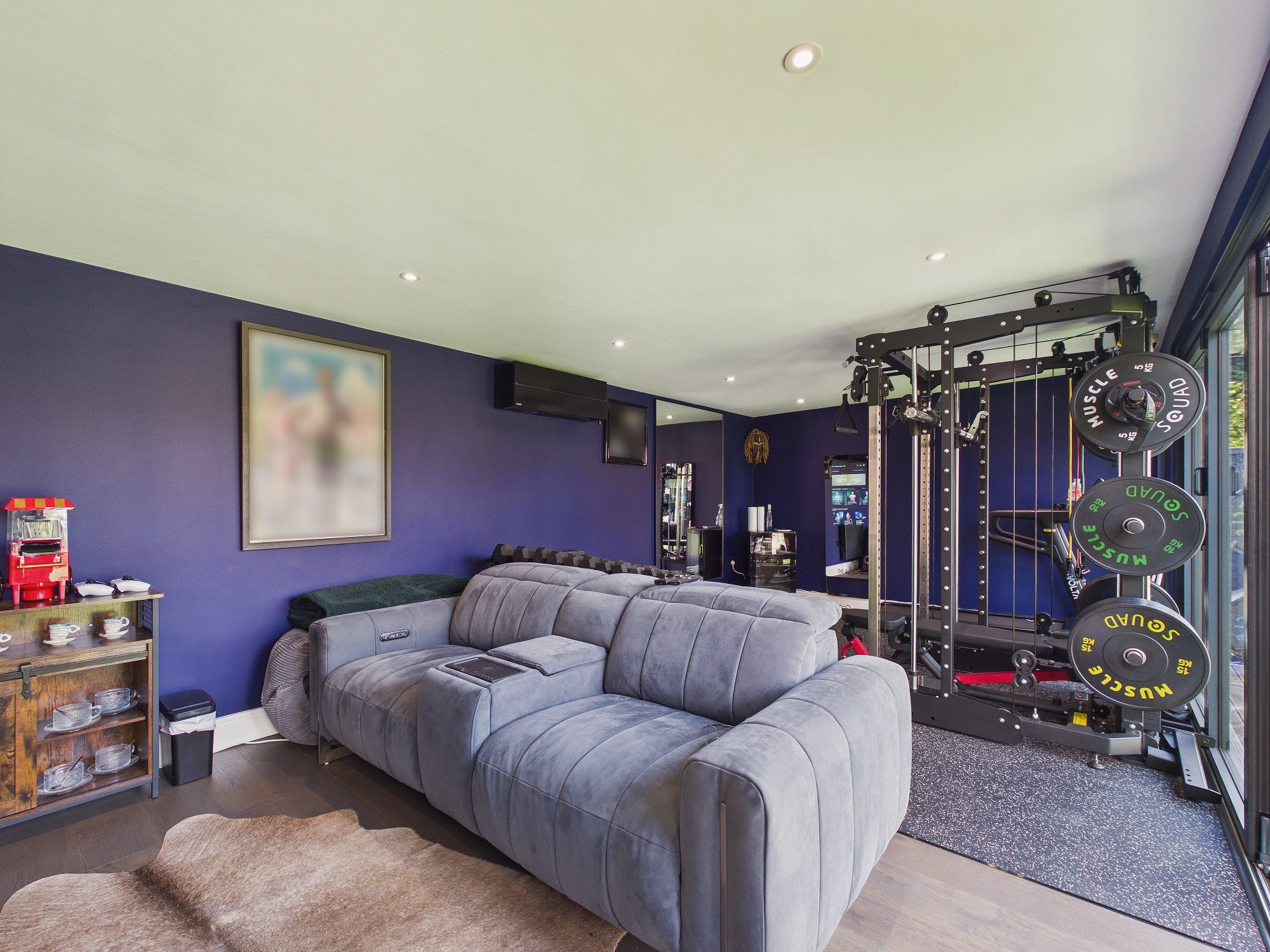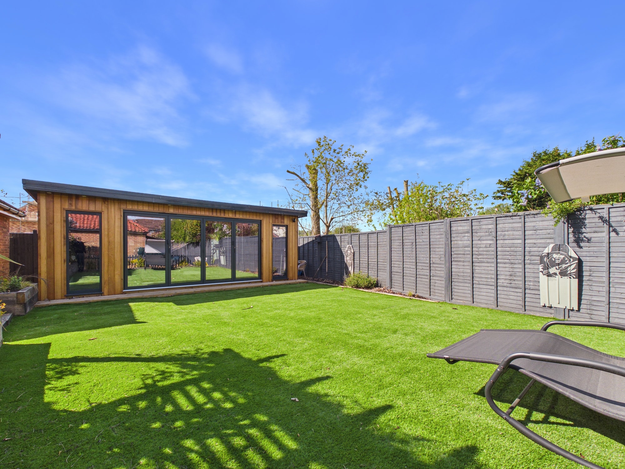 There is an insulated outbuilding with full power, light and air conditioning which is currently used as a home gym and cinema room.