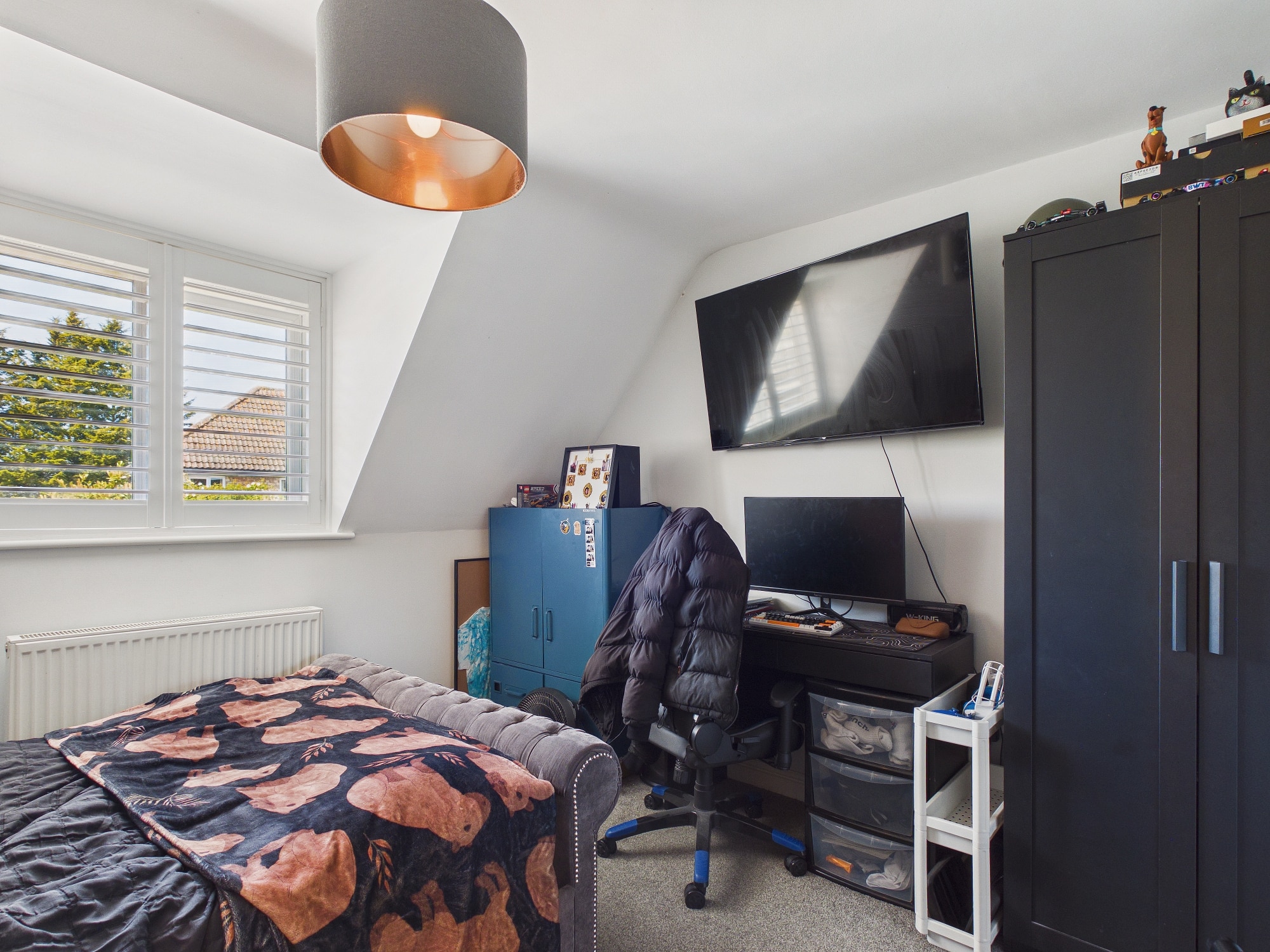 uPVC double glazed window to rear with shutters, wall mounted double panel radiator.