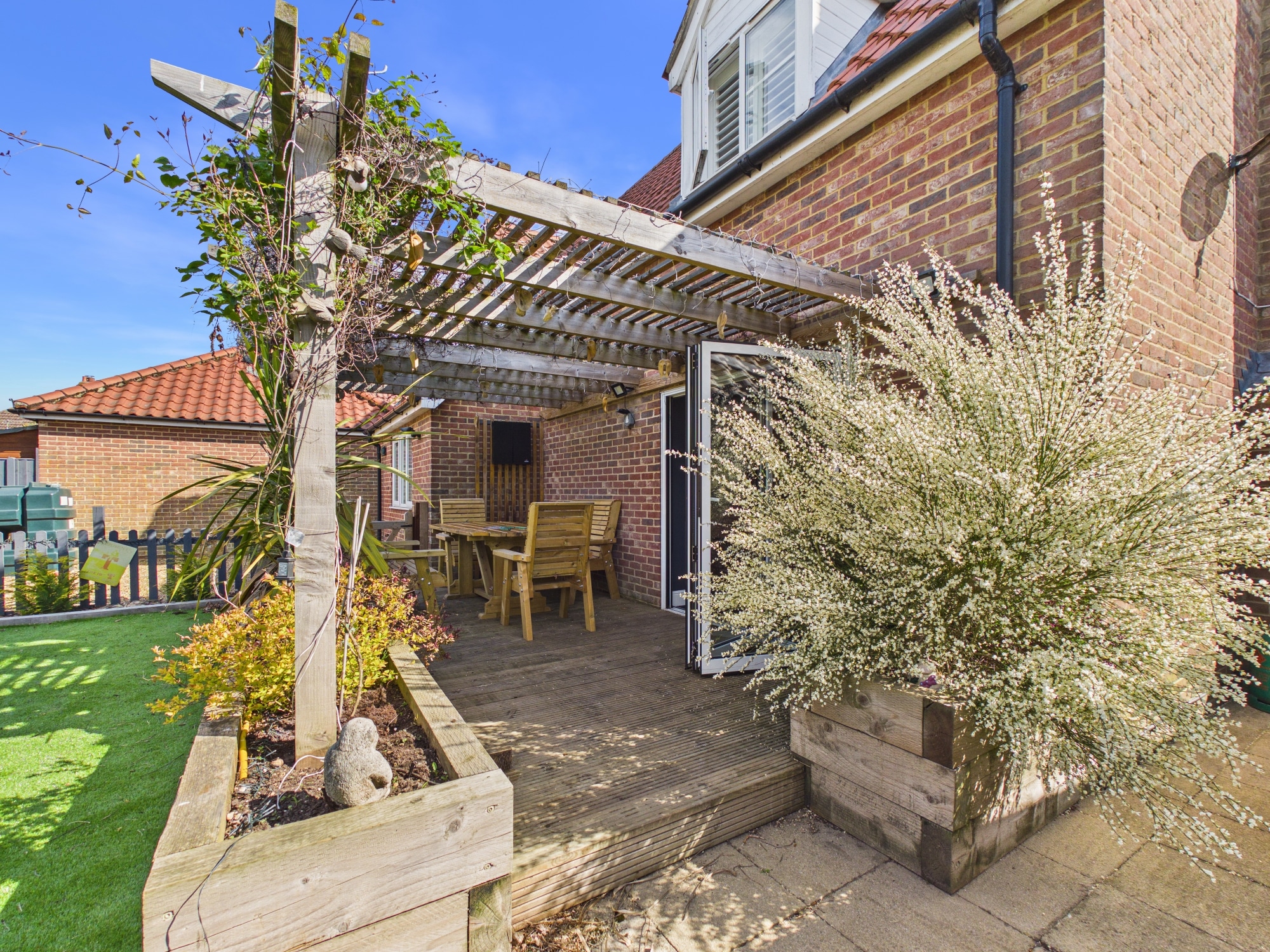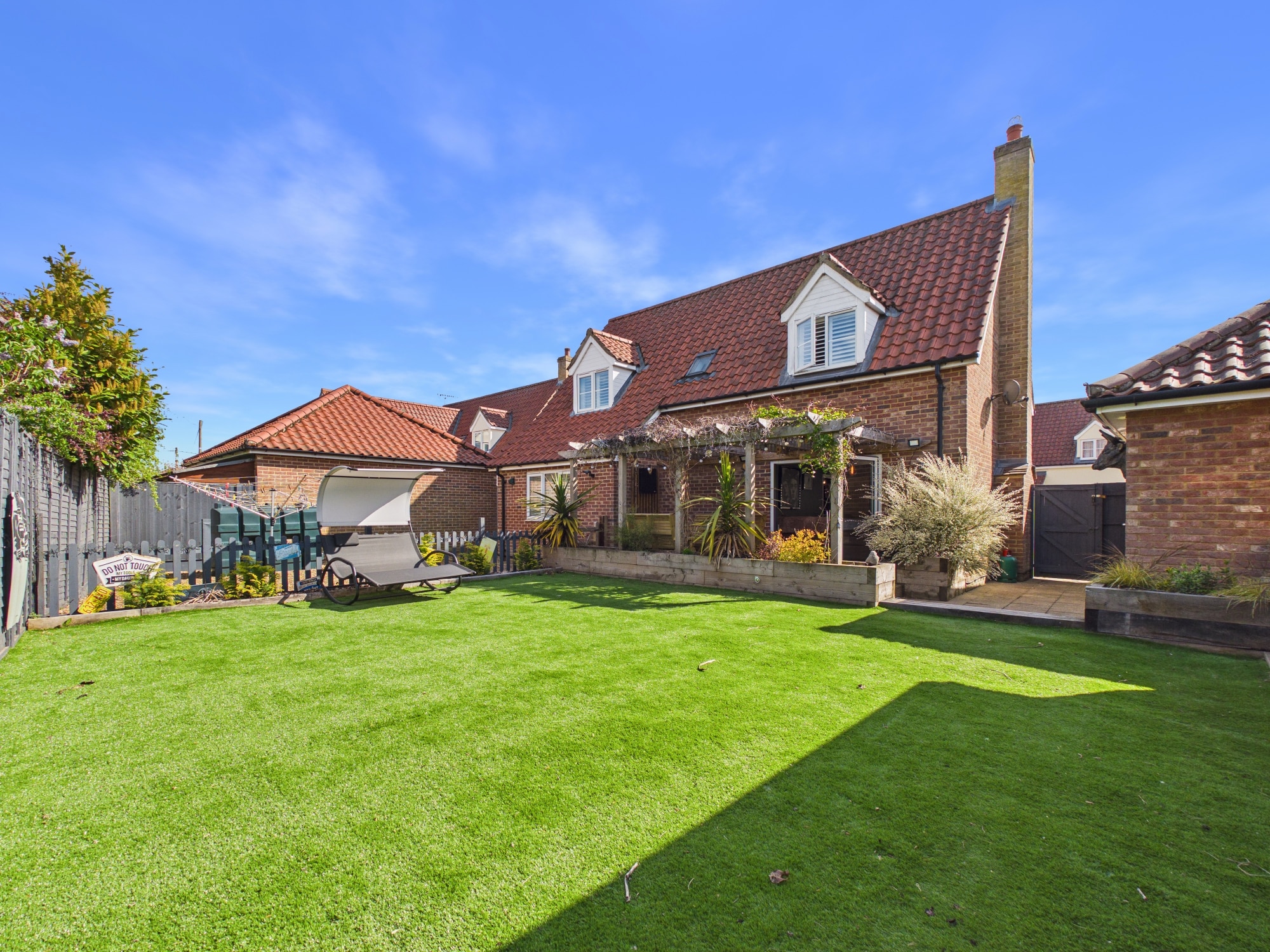 The front of the property is laid to lawn enclosed by post and rail fencing. The tarmac driveway provides off road parking and leads to the double garage. The rear garden is laid to astro turf and shingle with a pergola and patio area.
