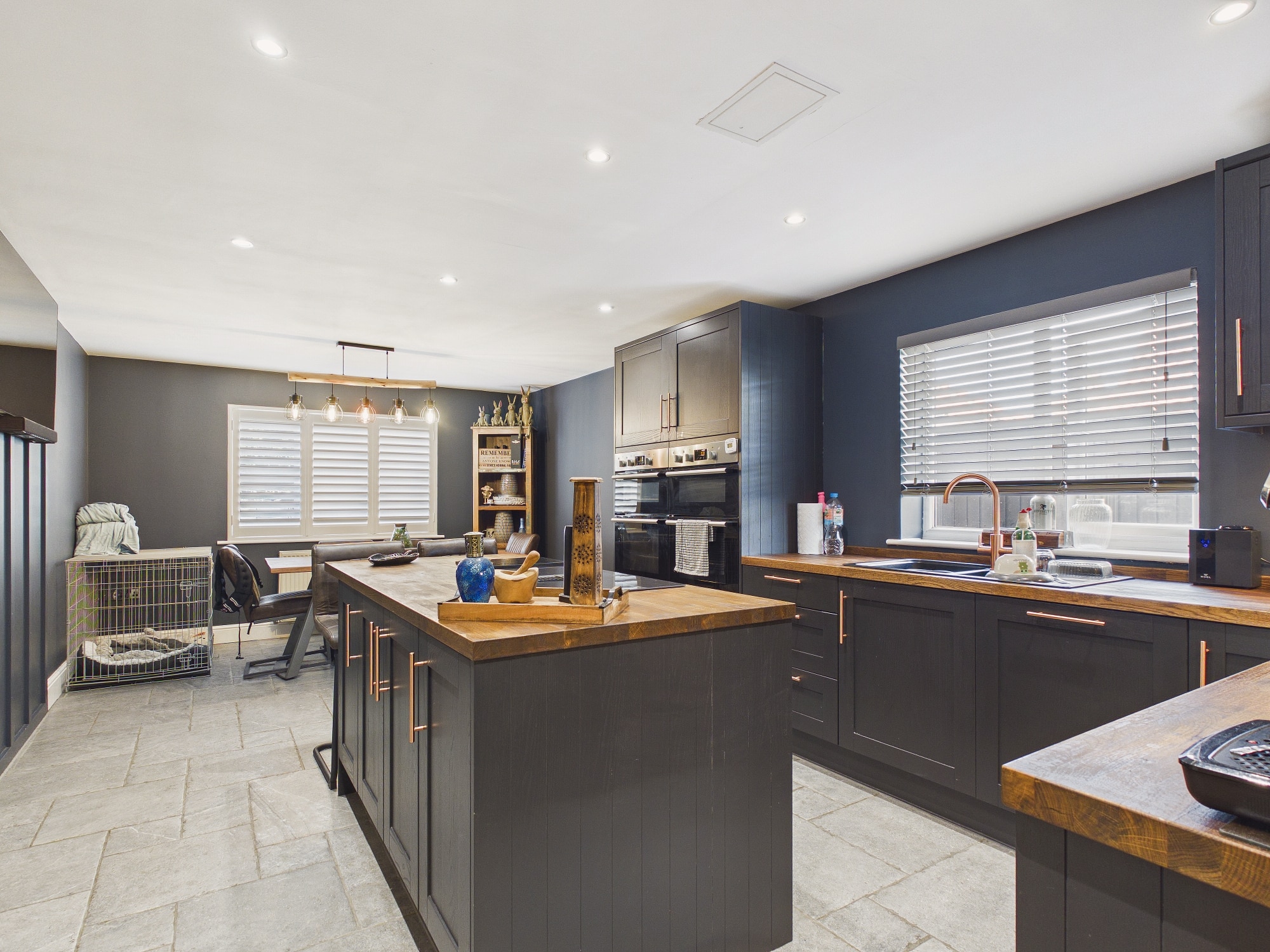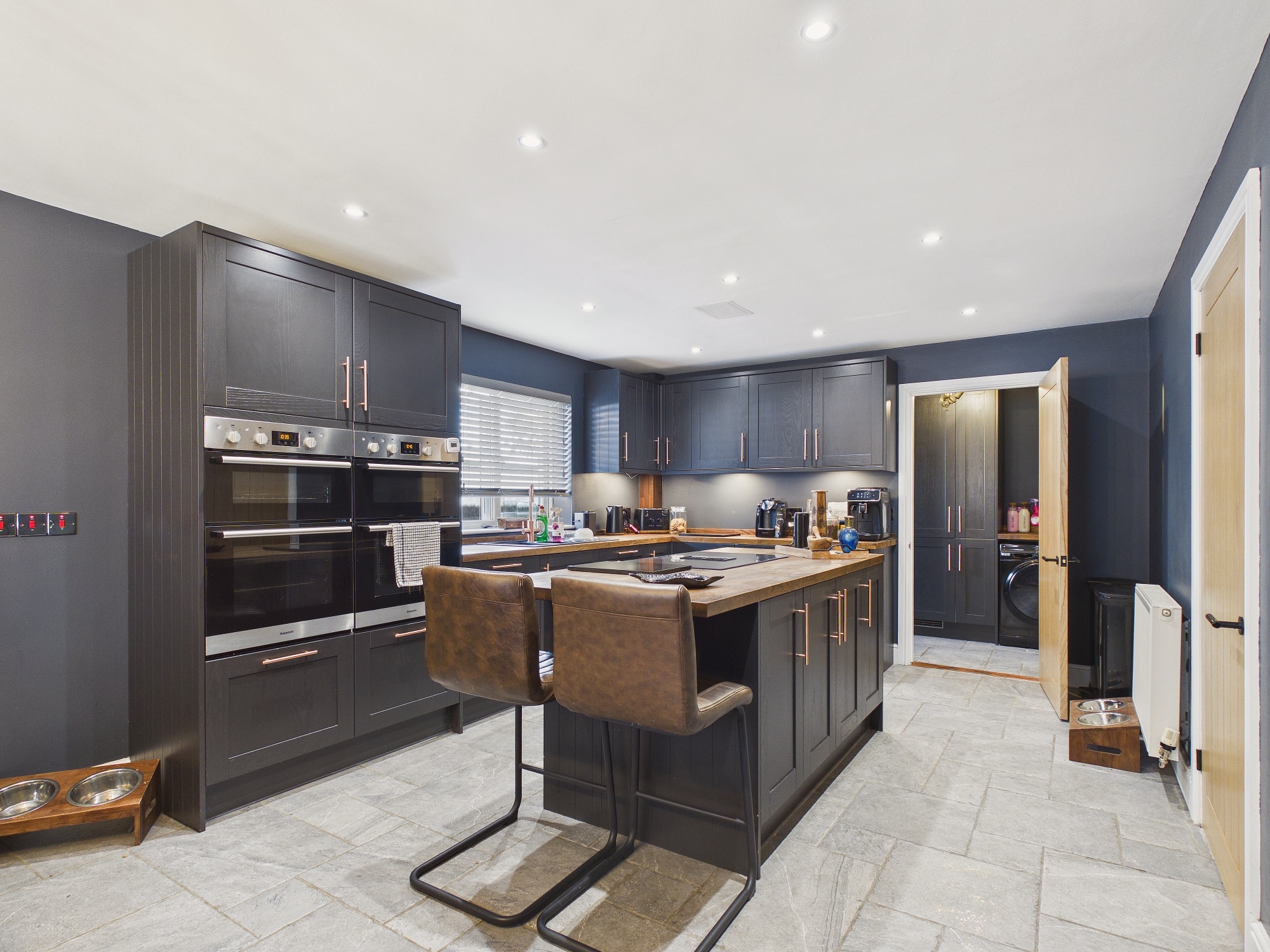 uPVC double glazed window to side, uPVC double glazed window to rear with shutters, wall and base units with centre island and breakfast bar, solid wood block worksurfaces, 1 1/2 sink drainer with mixer tap over, induction hob with extractor inset to island, eye level double ovens with grills, integral wine cooler, integral dishwasher, 2 x wall mounted double panel radiator, tiled flooring, ceiling spotlights, door to:-