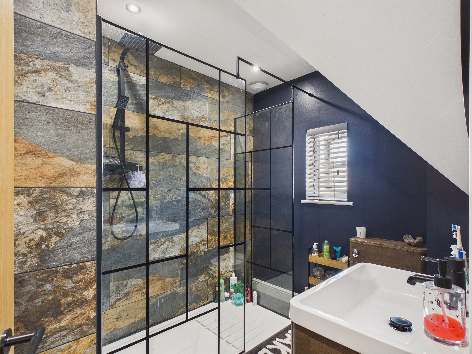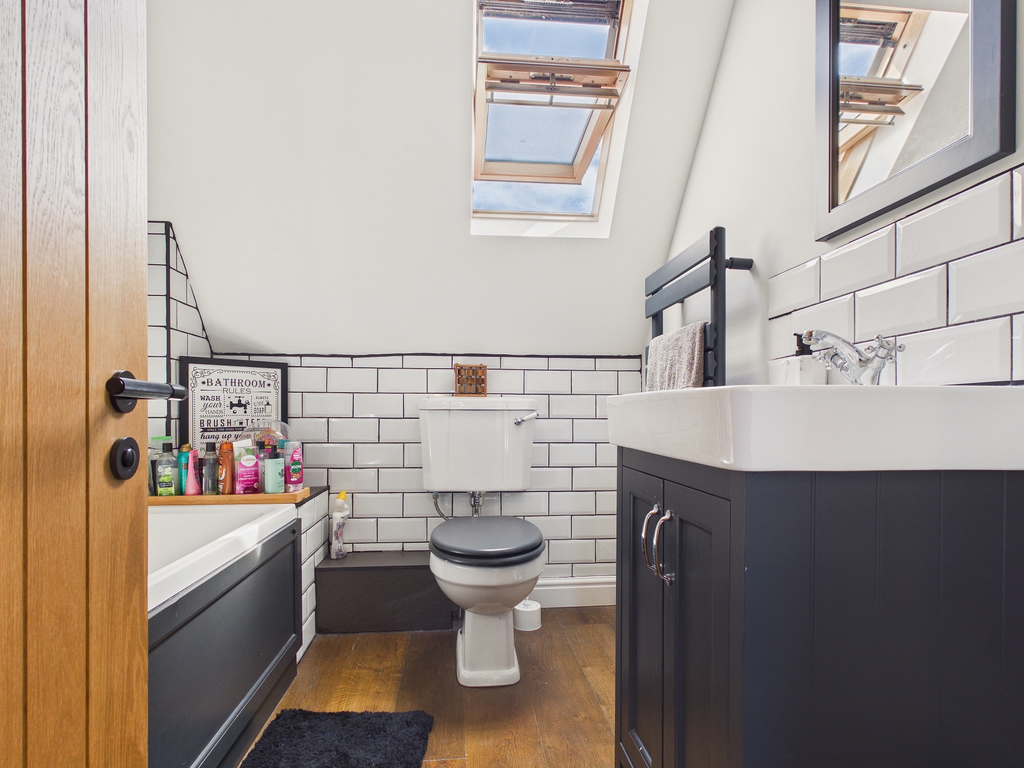 Velux window to front, wall mounted heated towel rail, panelled bath with mixer tap and shower over with glass shower screen, w.c., handwash basin inset to vanity unit, engineered oak flooring, partly tiled walls, extractor.