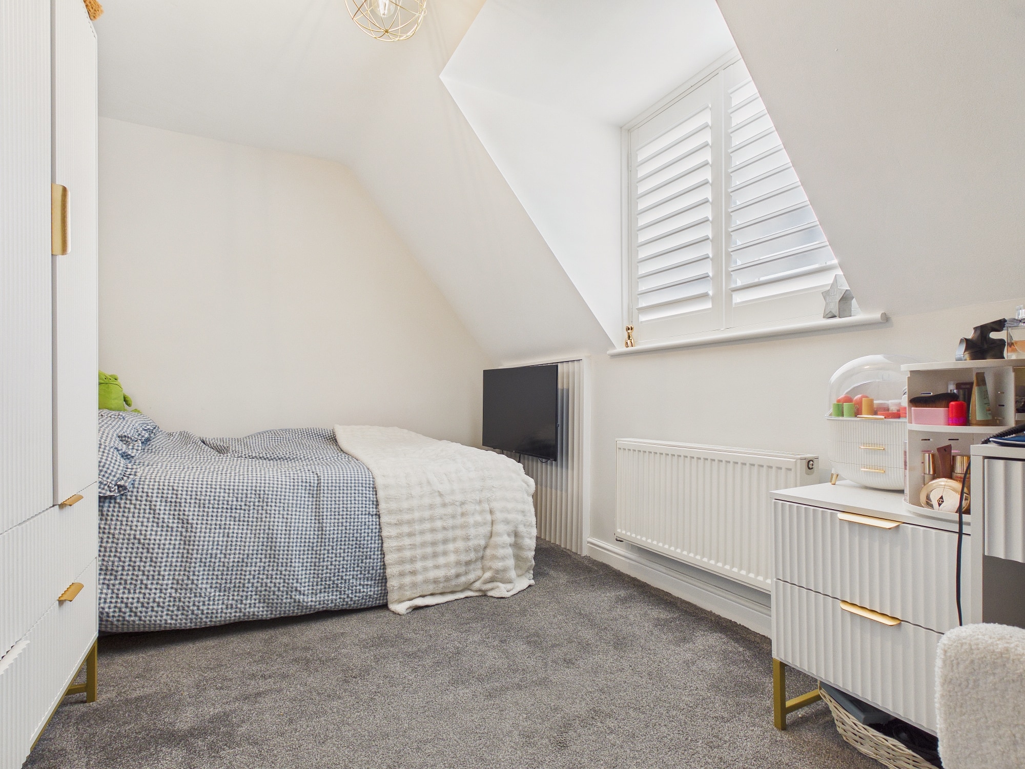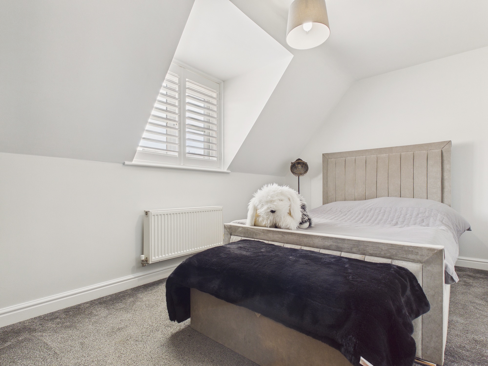 uPVC double glazed window to front with shutters, wall mounted double panel radiator.