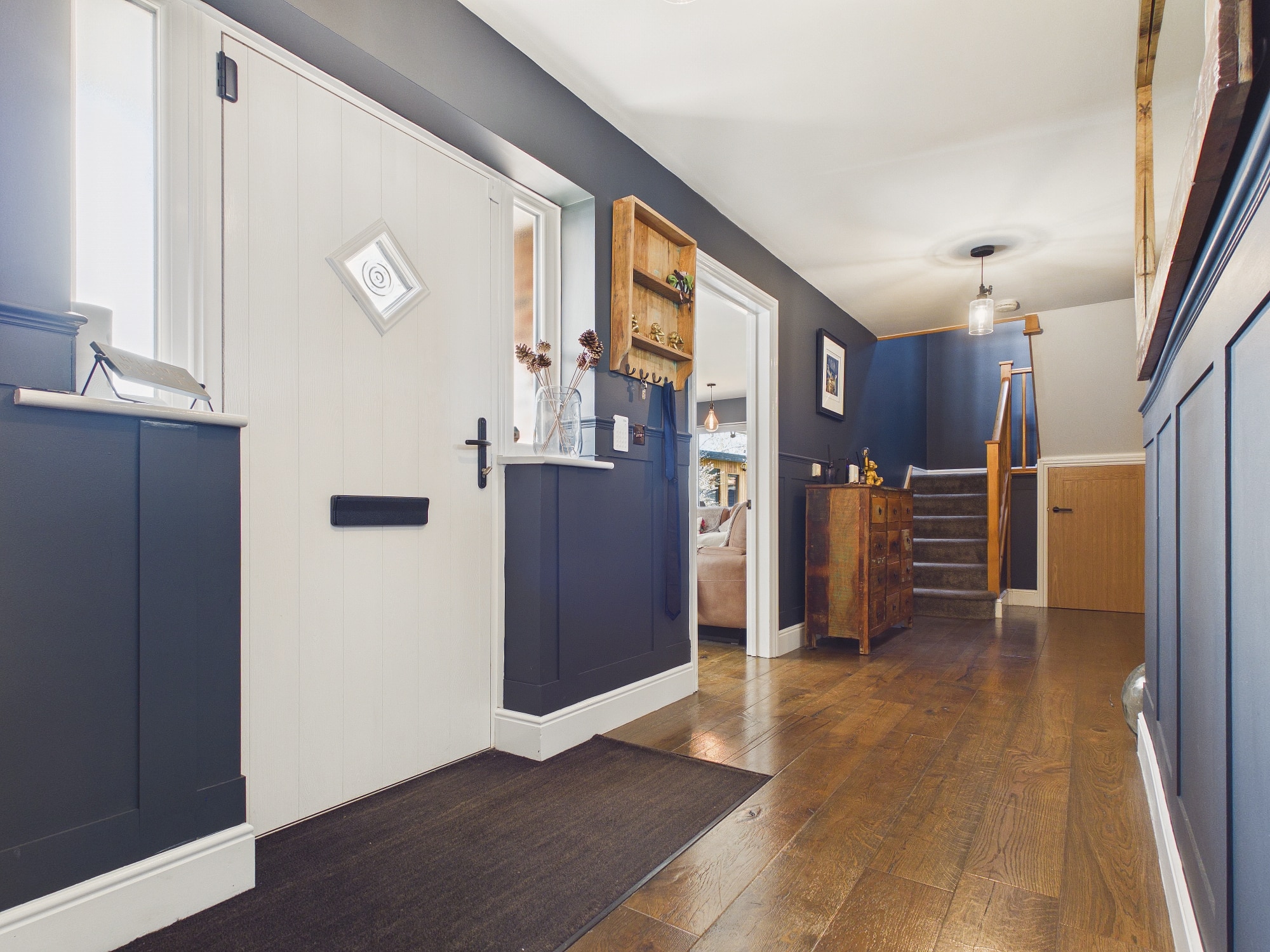 Wall mounted radiator with decorative cover, engineered oak flooring, wall panelling, stairs to first floor with storage cupboard under, doors to all rooms.