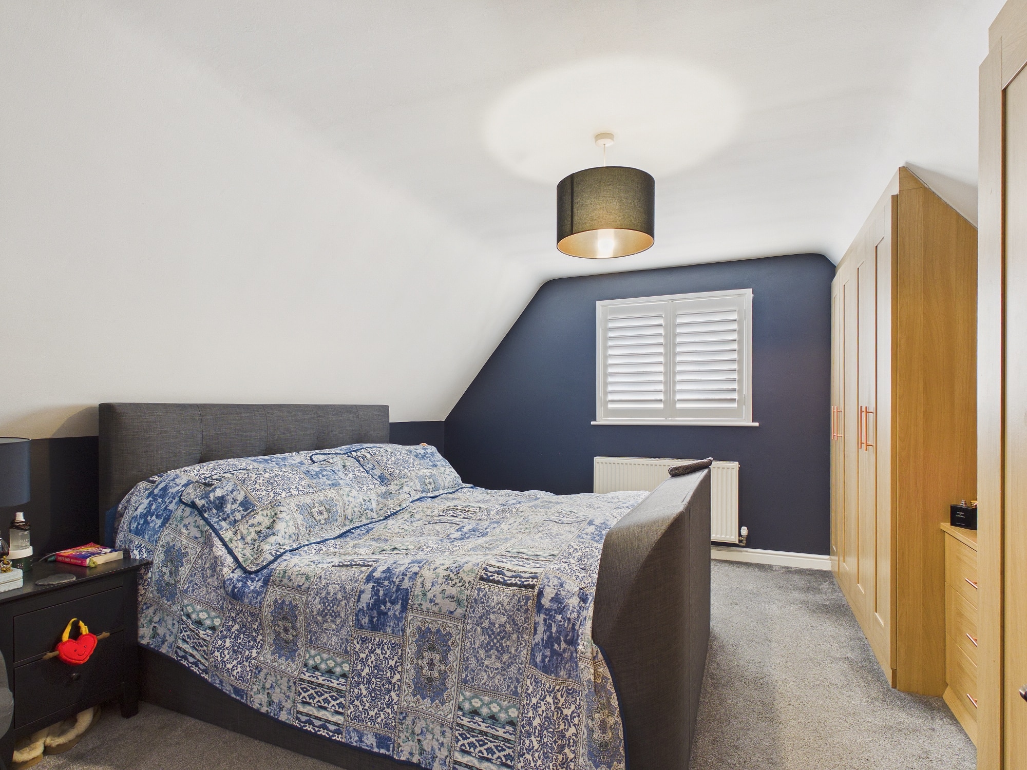 uPVC double glazed window to front with shutters, wall mounted double panel radiator, built in wardrobes and storage, door to:-